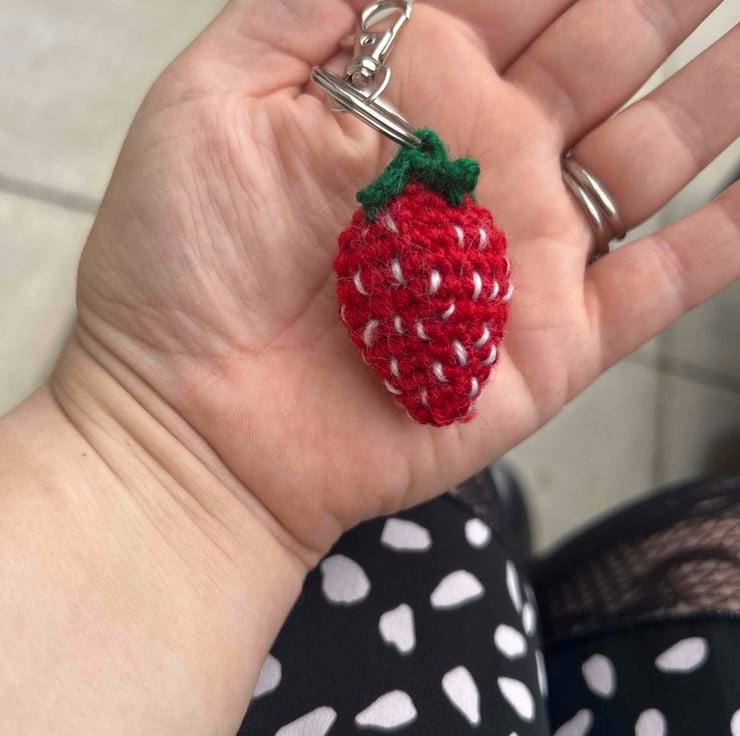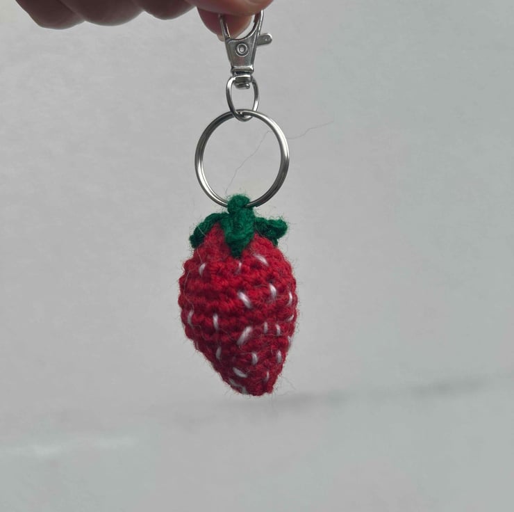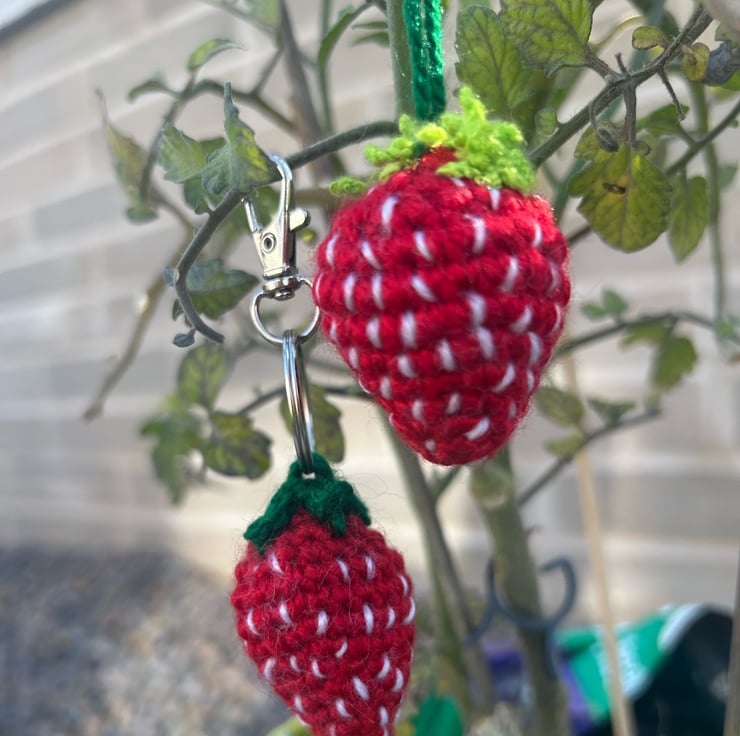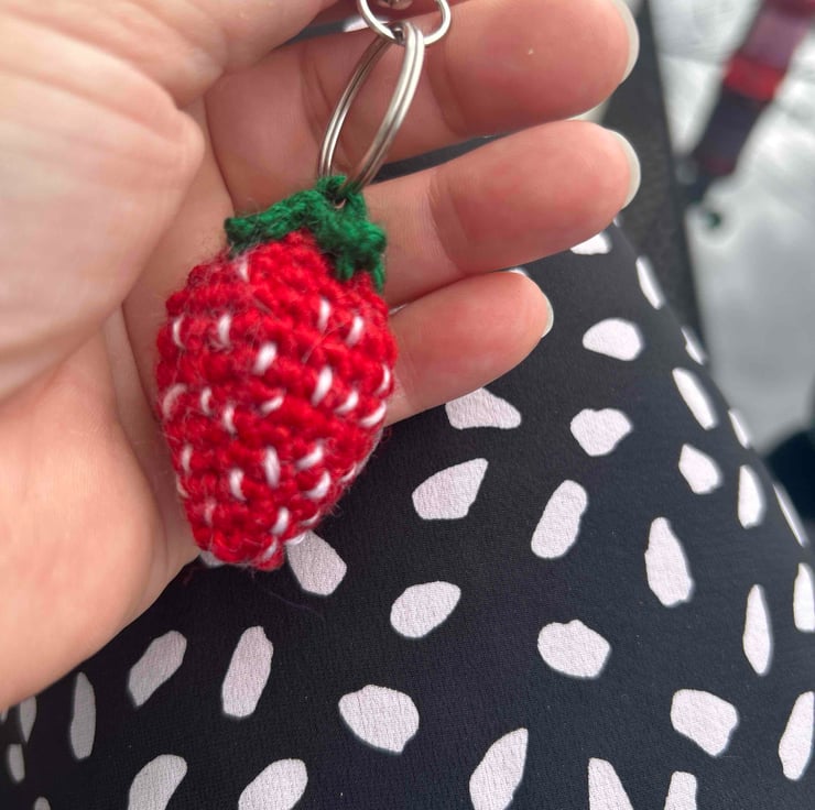 Hand crocheted strawberry keyring / bag charm with dark green leaves . Hand made by me in Moray, Scotland. Unique.