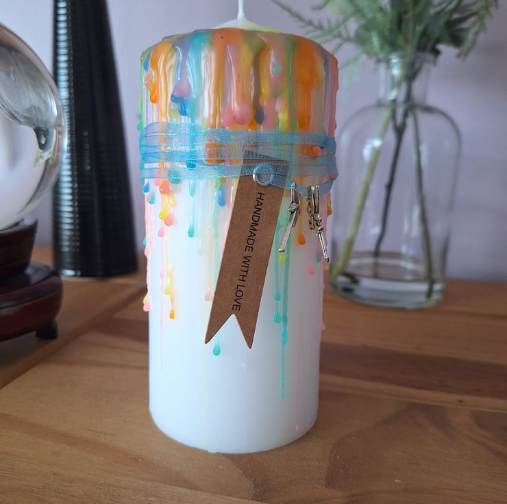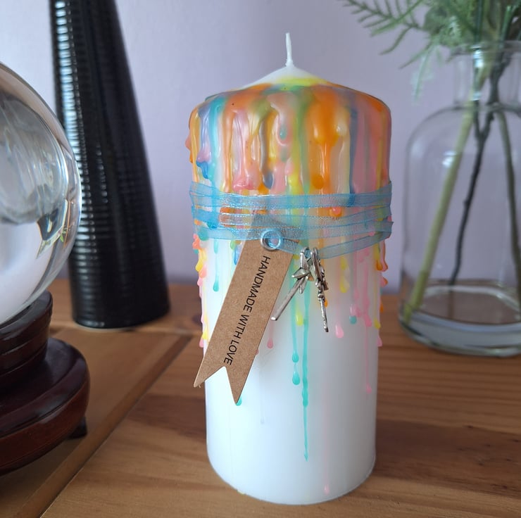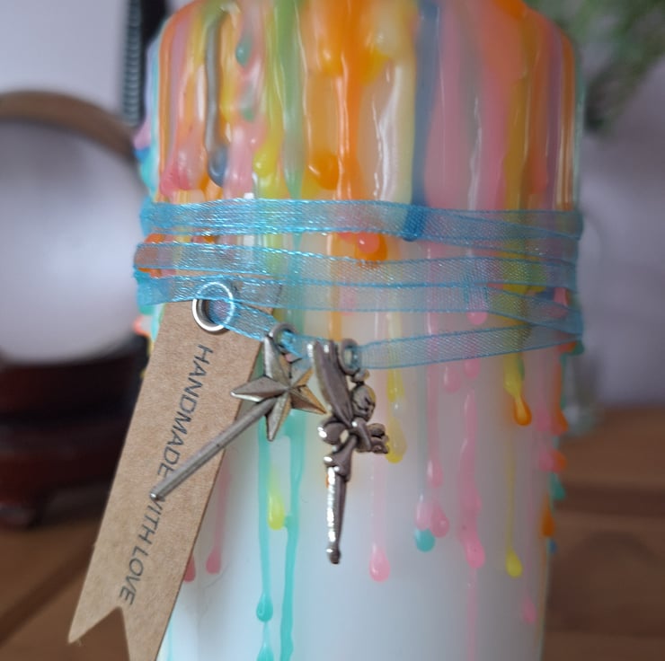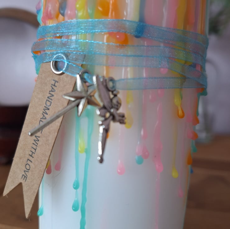 A beautiful hand made dripped candle,inspired by the enchanting theme of the fairy realm in soft pastel colours. Embellished with a fairy and wand charm and ribbon (please note ribbon and charms should be removed prior to lighting the candle). This candle would make a lovely addition to your home decor.