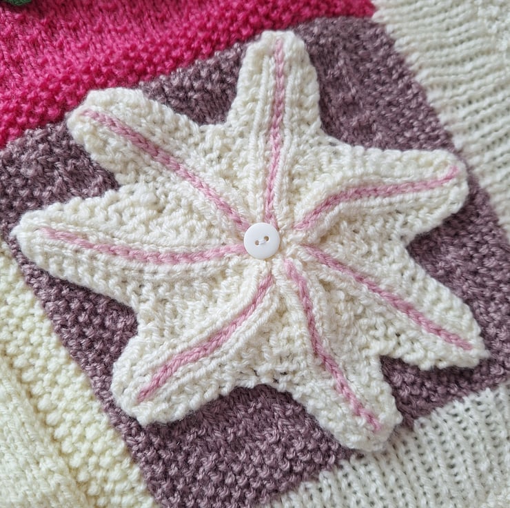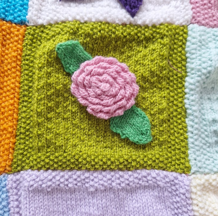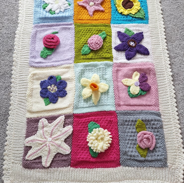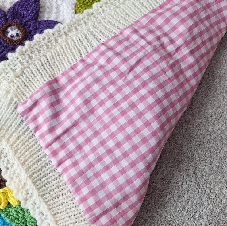 A beautiful knitted patchwork throw inspired by the summer season. Appliqued with various hand knitted flowers and lined with gingham fabric. The throw measures 52cm (20.5inch) by 80cm (31.5inch) approx.