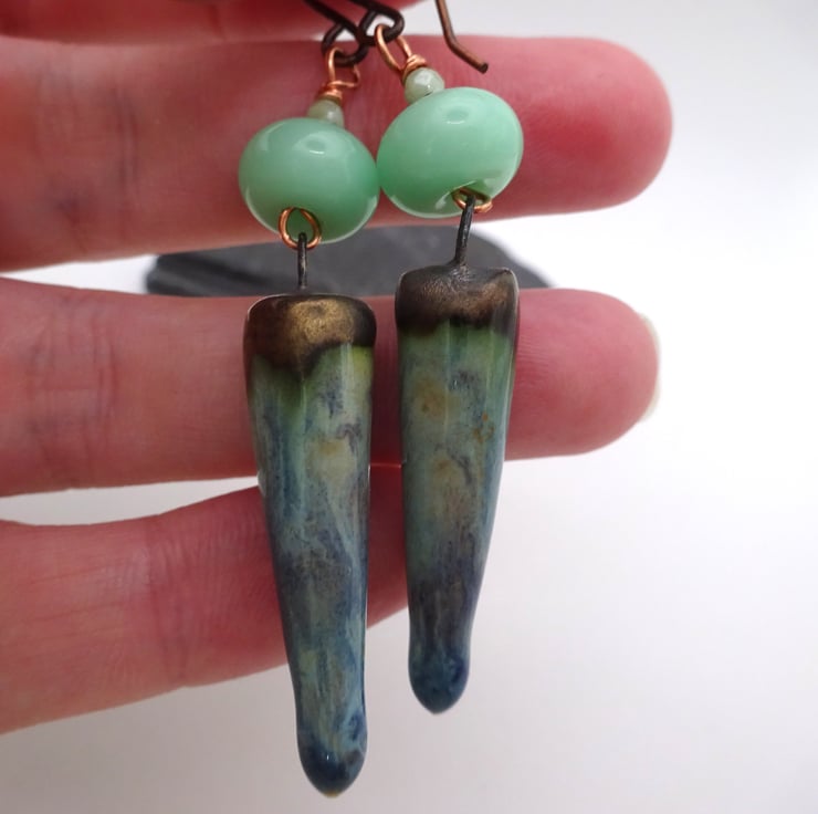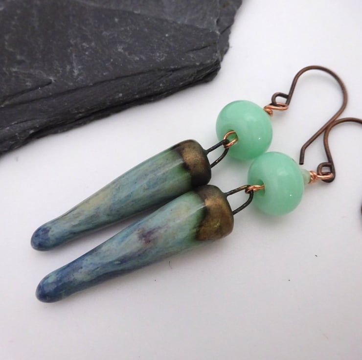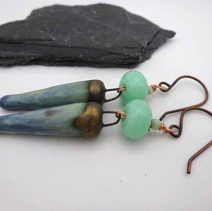 A pair of copper earrings which feature green handmade lampwork glass beads and ceramic spikes with a blue/green glaze.