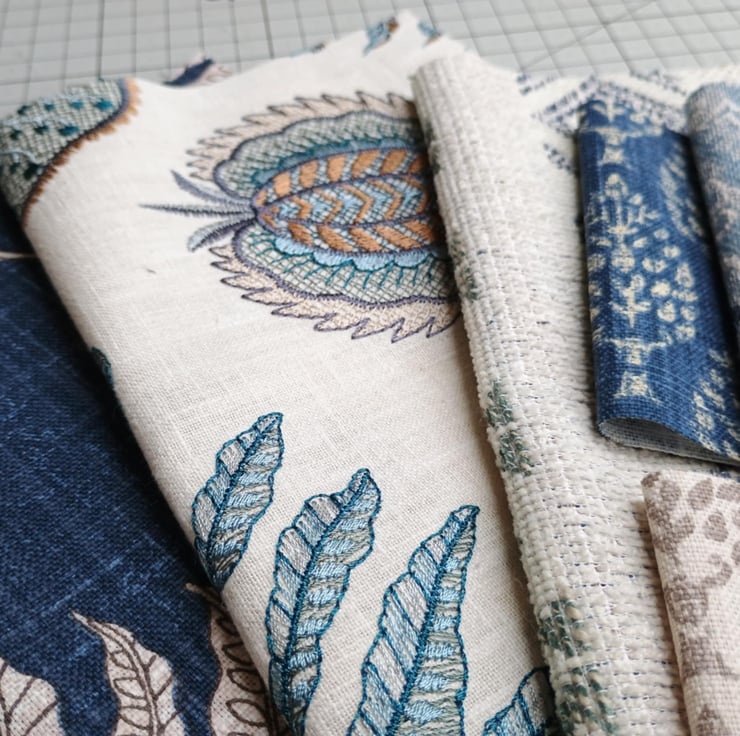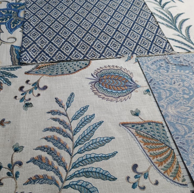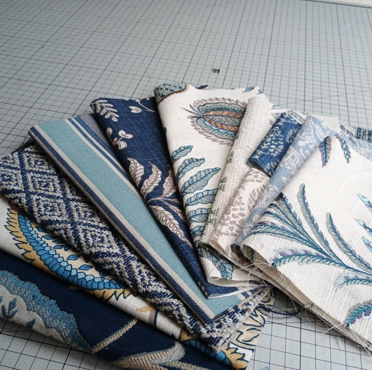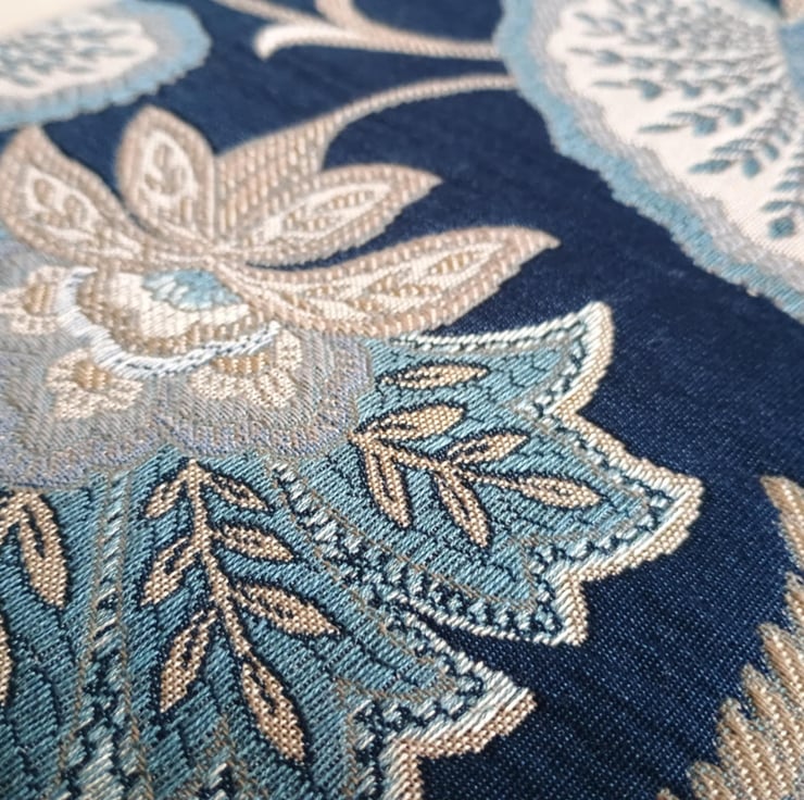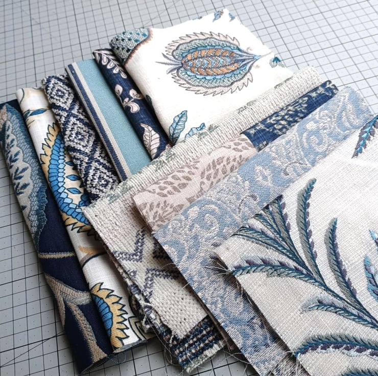 Sapphire blue, offset by navy, turquoise and cream. Stunning fabrics inspired by the trade routes which connected the East to the West. A blend of geometric and botanical patterns, the bundle includes tapestry jacquards, large scale medallions, neutral wovens, floral prints and trailing embroideries. All beautifully co-ordinated.