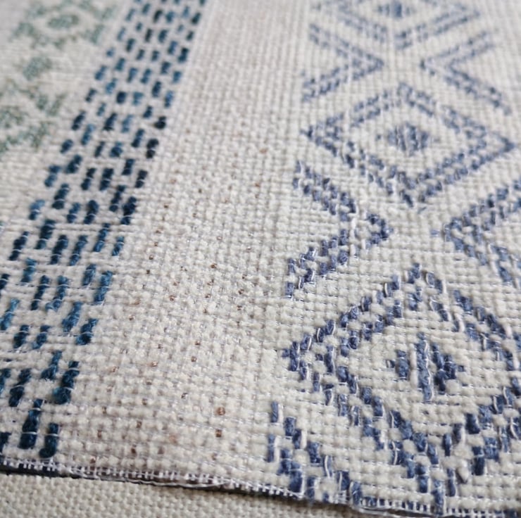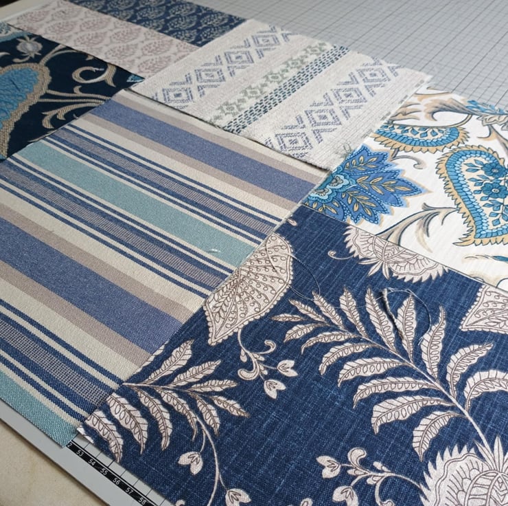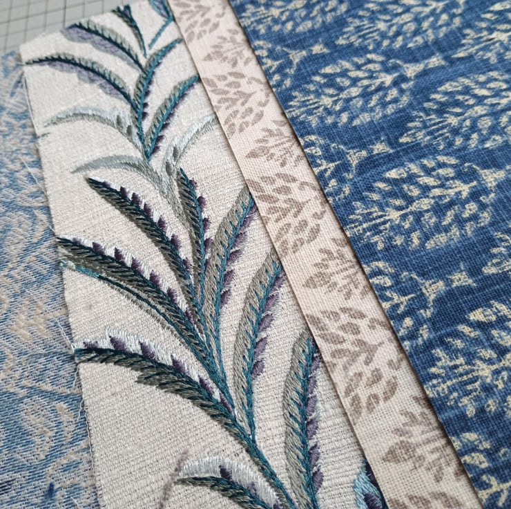 Zero waste. I salvaged this fabric from a curtain and upholstery sample book - the Silk Road collection by ILIV - that was destined for landfill before I rescued it. I carefully deconstructed the book, and cut the usable fabric from each sheet with a rotary blade.