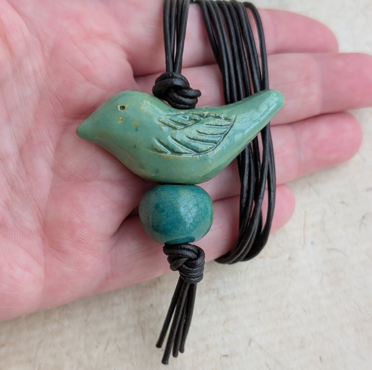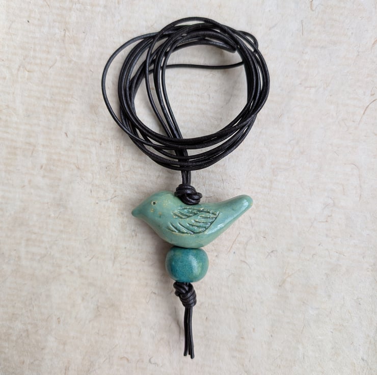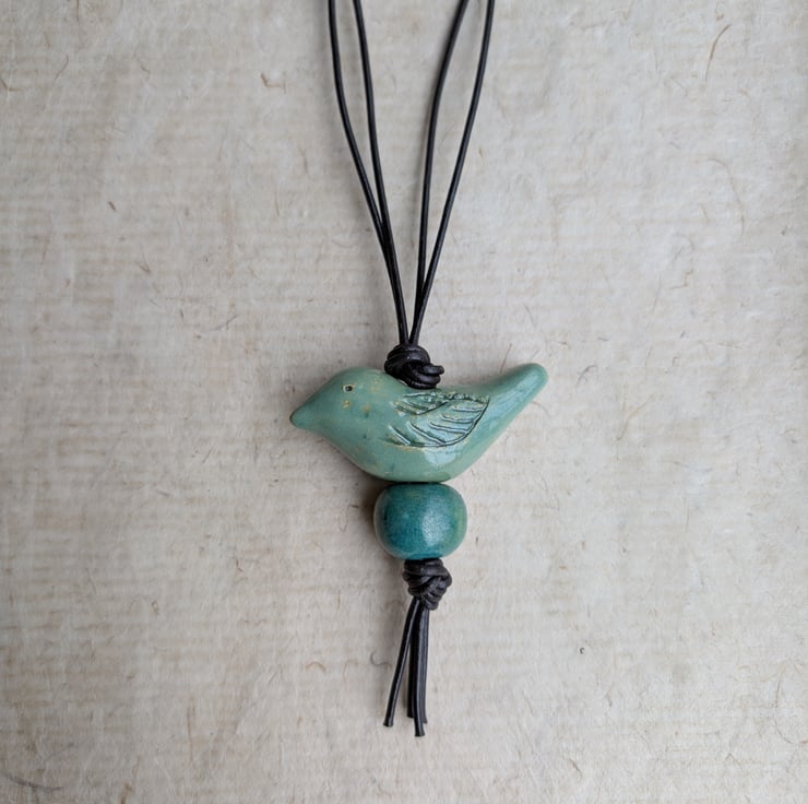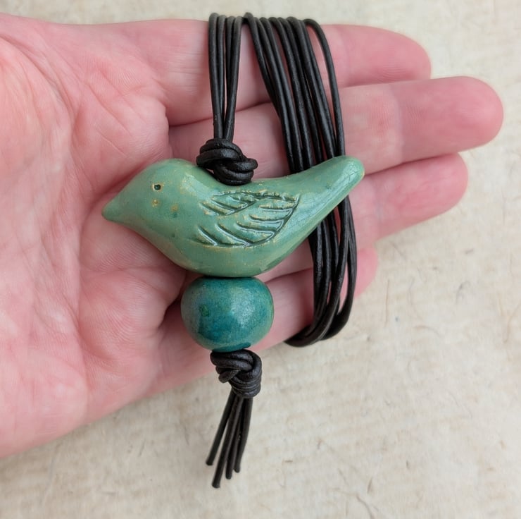 This simple necklace features a beautiful handmade ceramic bird in a lovely soft bluey green colour. It's sitting on a plain round ceramic bead and they're both attached to a double length of dark brown leather cord.