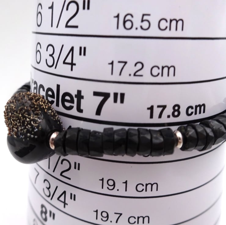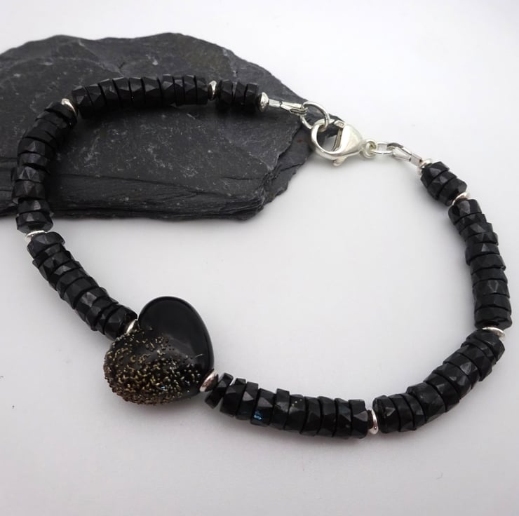 A bracelet made with Black Spinel gemstone beads and sterling silver beads. The bracelet features a handmade lampwork glass black heart bead.