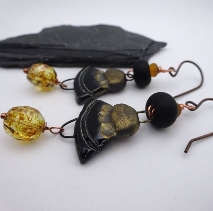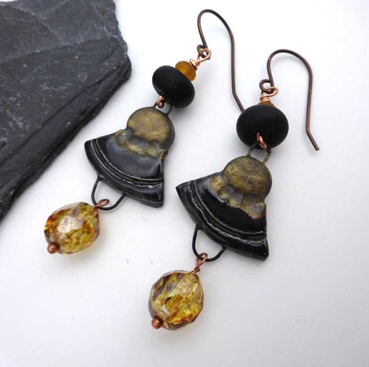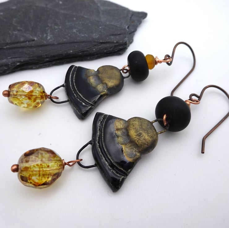 A pair of earrings made with copper ear wires, handmade black lampwork glass beads and handmade ceramic drops.