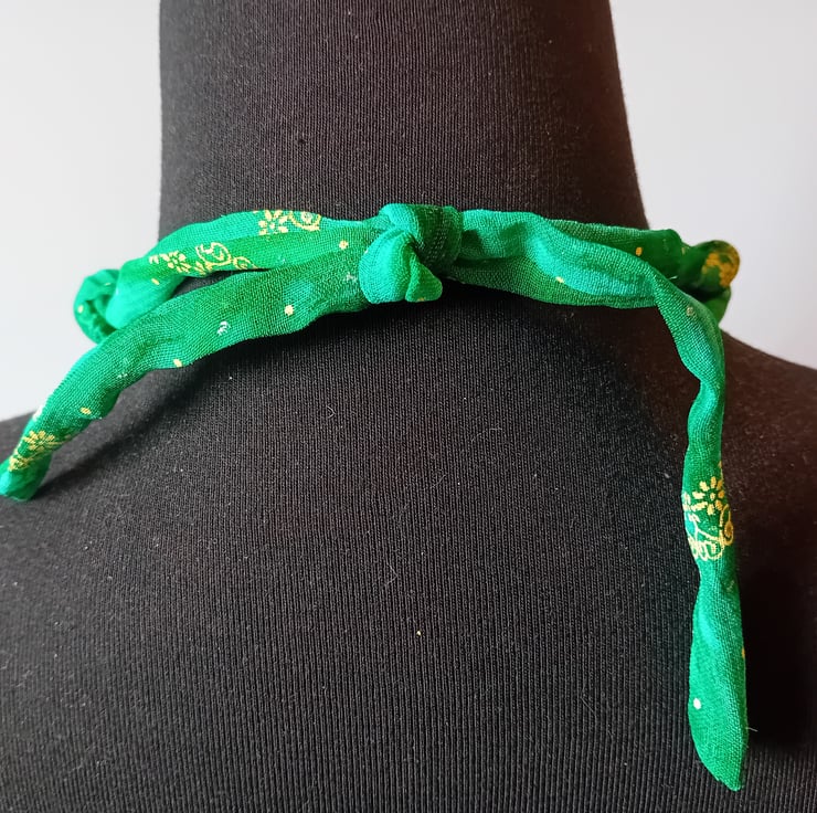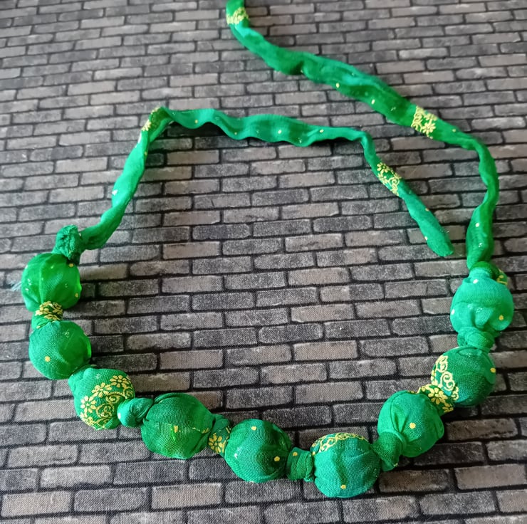 We have lots of vintage head scarfs and sari fabrics all vibrant and interesting colours. We also love repurposing charity shop finds, bead necklaces being one of our favourites. Combining the two produces these amazing necklaces.