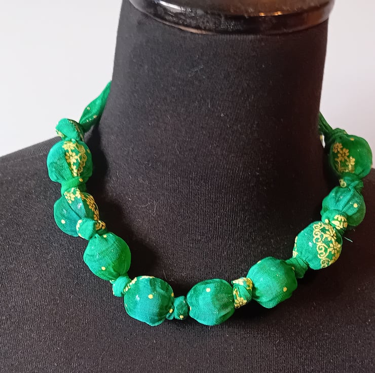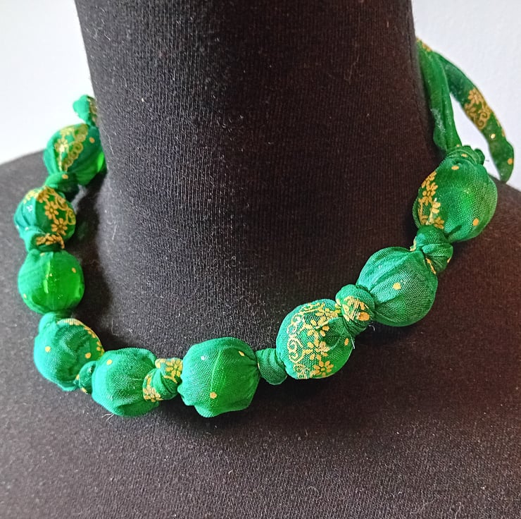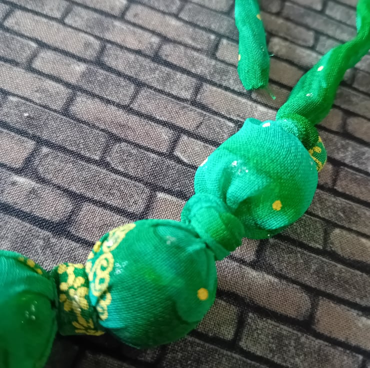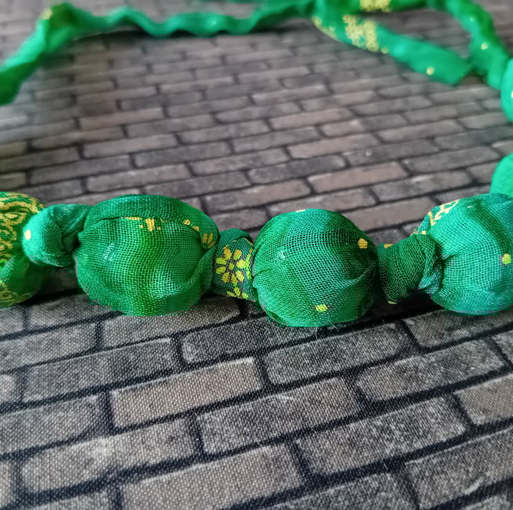 Made from a soft upcycled fabric in leafy green with cheerful gold details, this necklace is vibrant, tactile, and totally unique. Each reclaimed bead is individually knotted into place inside a hand-sewn fabric tube, creating a flowing strand of colour and texture.