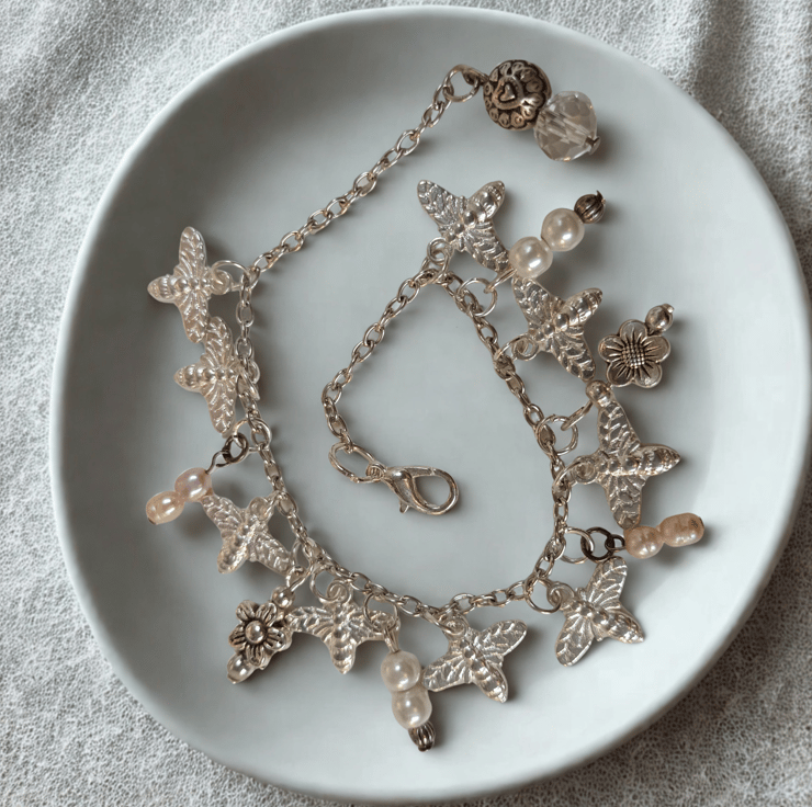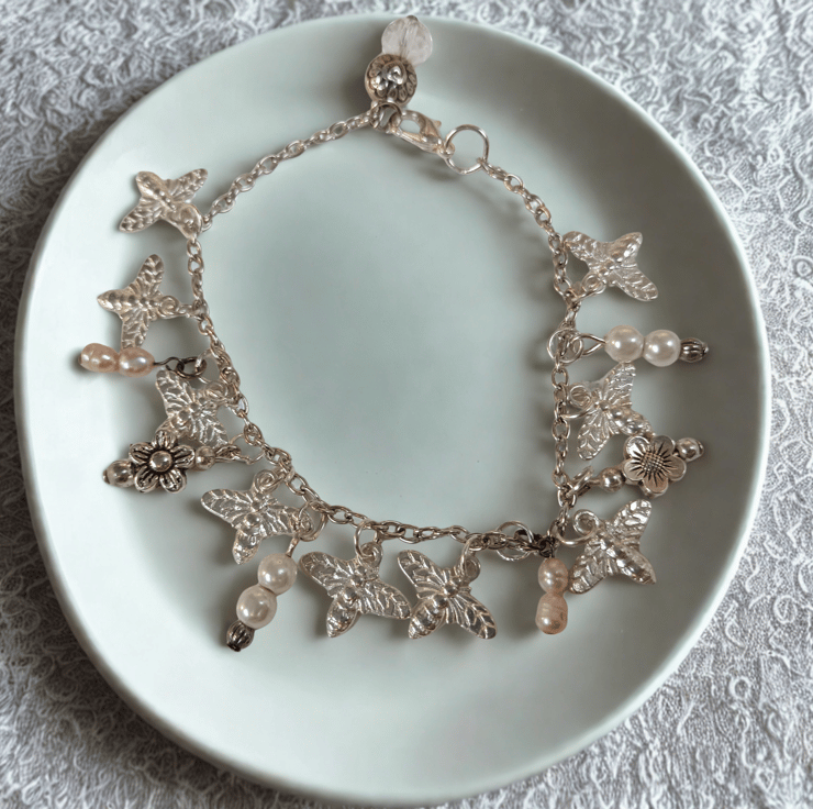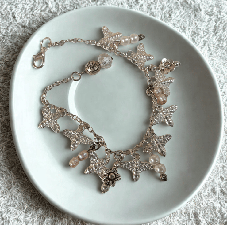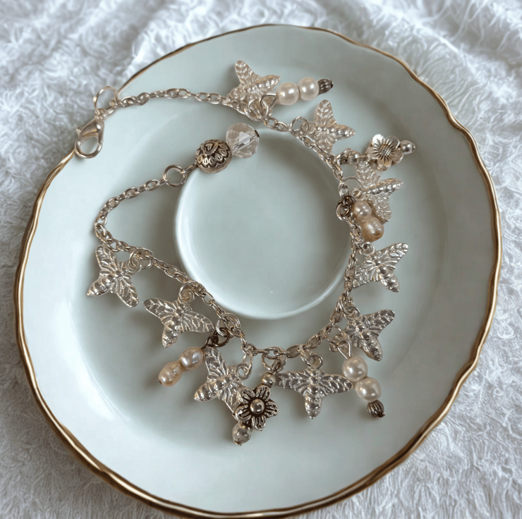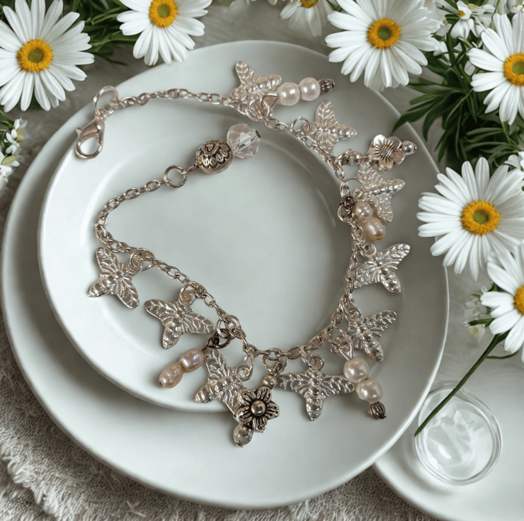Little silver bees dangling with silver flowers and tiny threads of pretty recycled beads on an adjustable 925 silver chain with a lobster catch. Just perfect for bee lovers. Lightweight and very pretty.