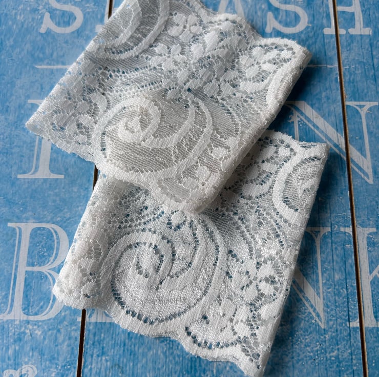 Sold as a pair. Having a scalloped design on each edge of the cuffs.