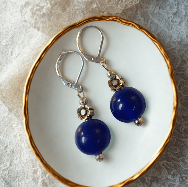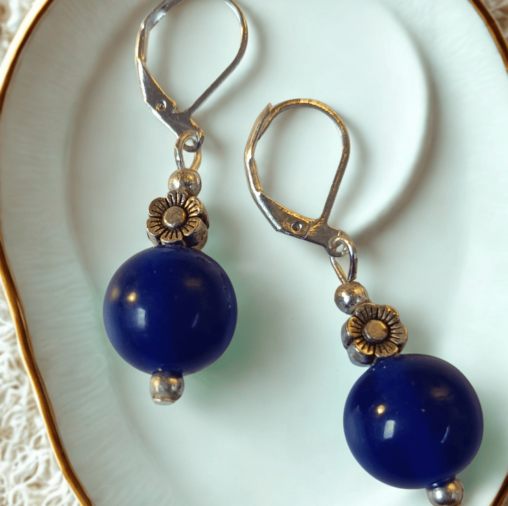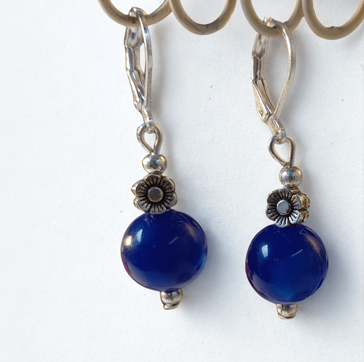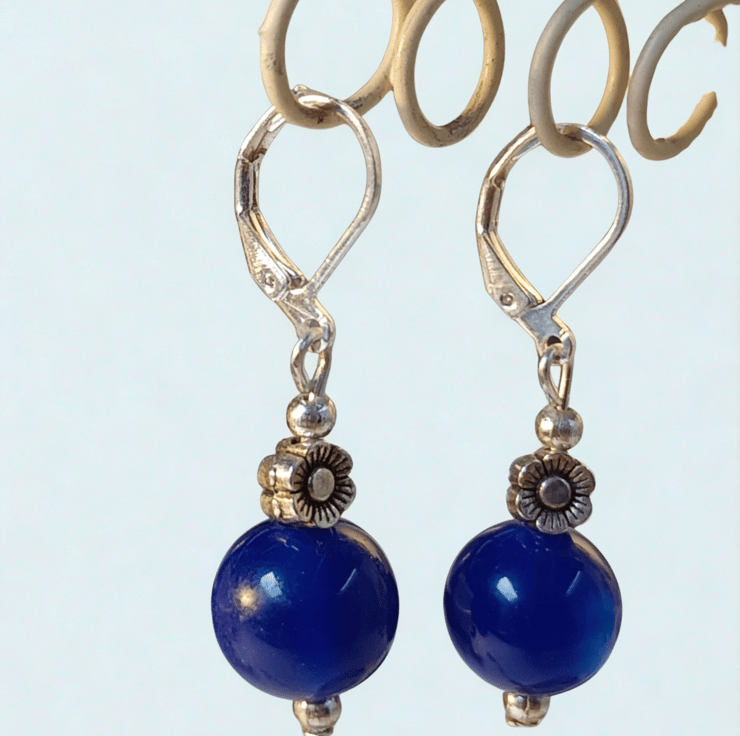 Deep dark as the night blue glass orbs with Tibetan silver flowers, simple and lovely. Hanging on nickel free 925 silver clasp and close hooks.