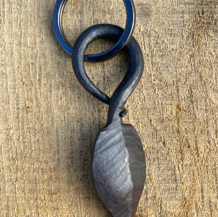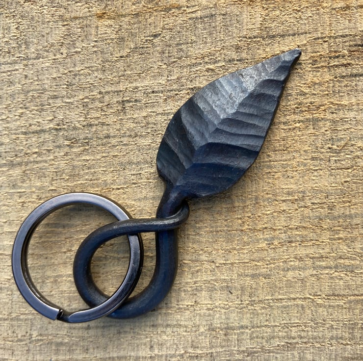 A hand forged natural looking leaf Keyring, finished with a coat of beeswax, that gives the metal a darker colour. Made using traditional blacksmithing techniques to a high quality.