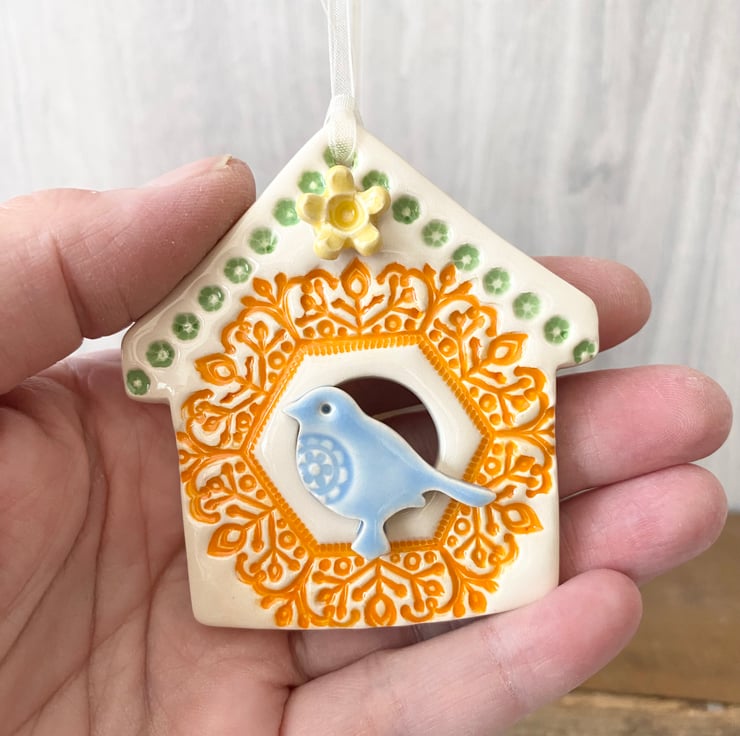 This ceramic bird house decoration is made from white earthenware clay and finshed with a little pottery bird. It has been fired twice and finished with a glossy glaze for a lovely smooth finish. It measures 6.5cm x 7cm x 1cm deep and hangs from a cream organza ribbon.