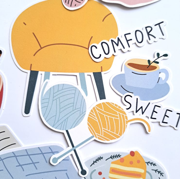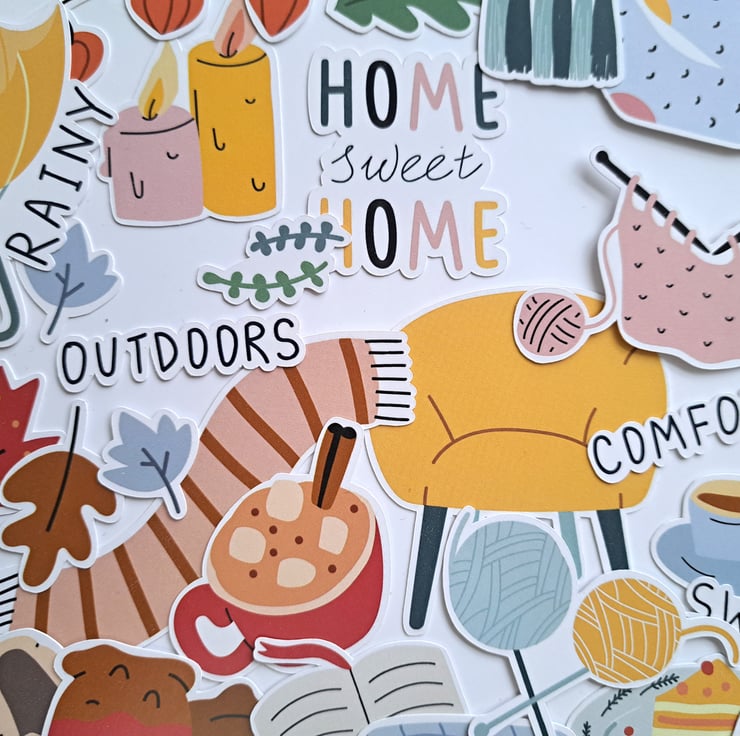 One set of handmade die cuts / ephemera / embellishments with an autumn hobbies theme, featuring knitting, and cosy evenings in. Printed onto 250gsm silk card. Perfect for card making, scrap book layouts, memory journaling, etc. There are 27 pieces in each pack. To give an indication of size, the umbrella is 5.3x6.3cm and the 'home sweet home' piece is 3.8x4.5cm.