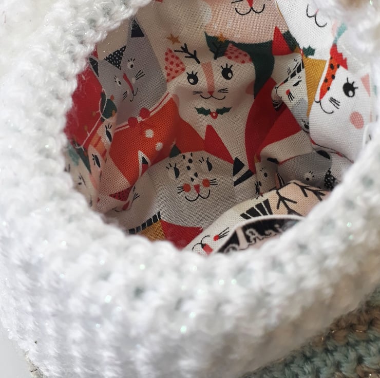 Created in gold, glittery white and duck egg blue acrylic yarn, this cat Christmas stocking is fully lined with a bright cats Christmas party design 100% cotton fabric.