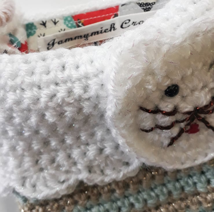 On the cuff of the stocking there is a cat face motif in glittery white yarn, with embroidered whiskers and safety eyes. A wooden loop on the back of the stocking makes it easy for you to hang the stocking on the fireplace ready for Santa.