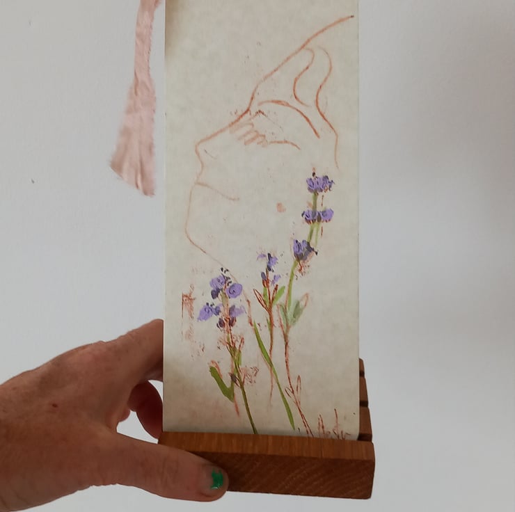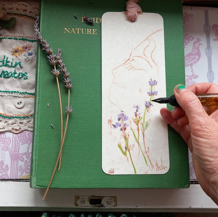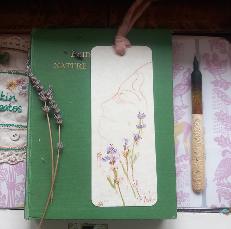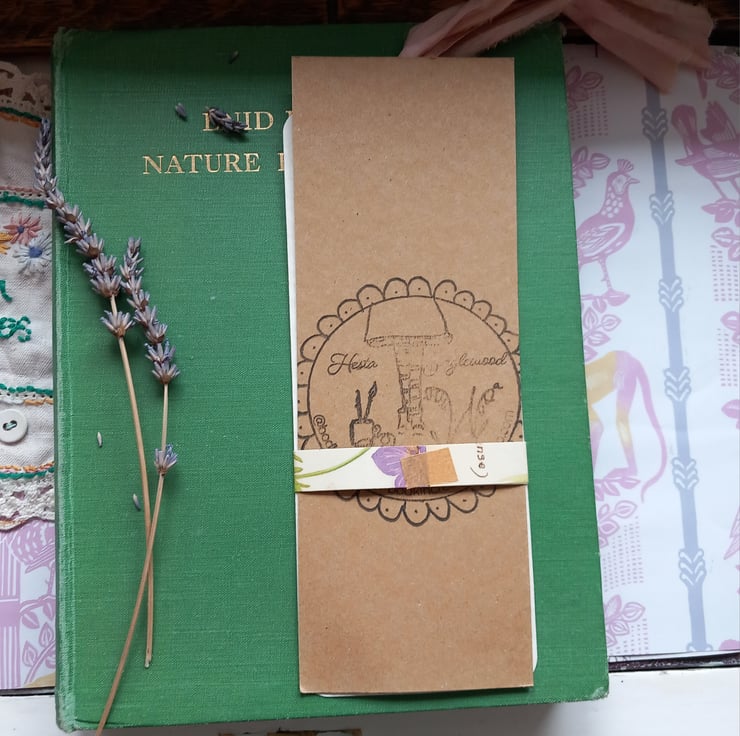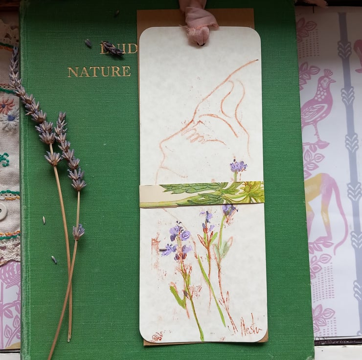 A beautiful printed , on a small printer , then I hand paint over with lavender and greens. A cottage industry. Made with love and care , packaged mindfully. All signed and with a silk ribbon trim. I even add a little lavender sent to the envelope.