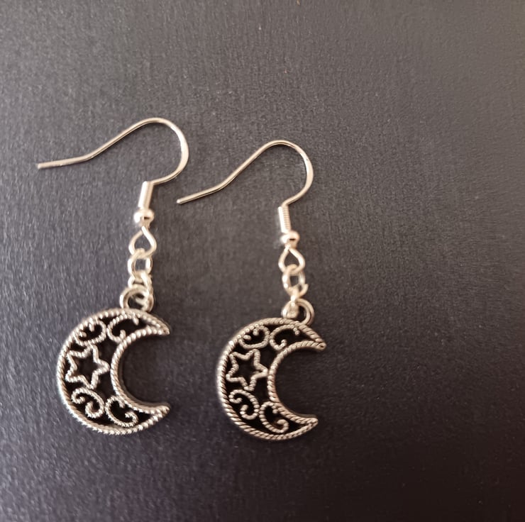 Handmade earrings crafted with stainless steel hooks and sterling silver moon and star detail charms.