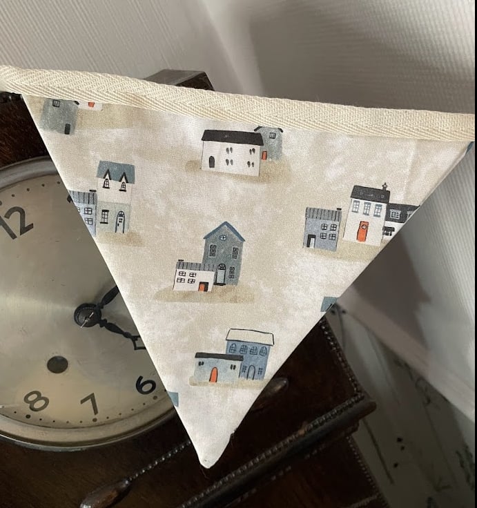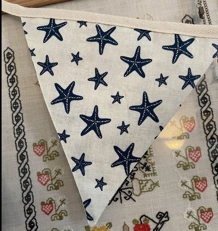 I recently stayed in an AirBnB with bunting in the lounge and it inspired me to make my own. I had used these seaside fabrics on my fish and love them, so thought they would work well,