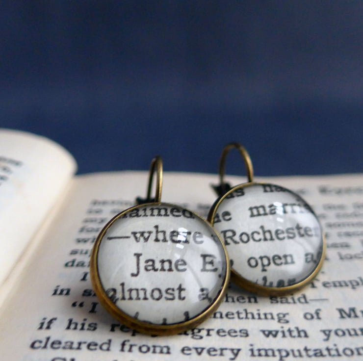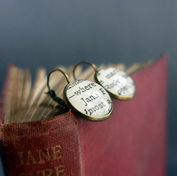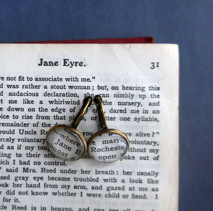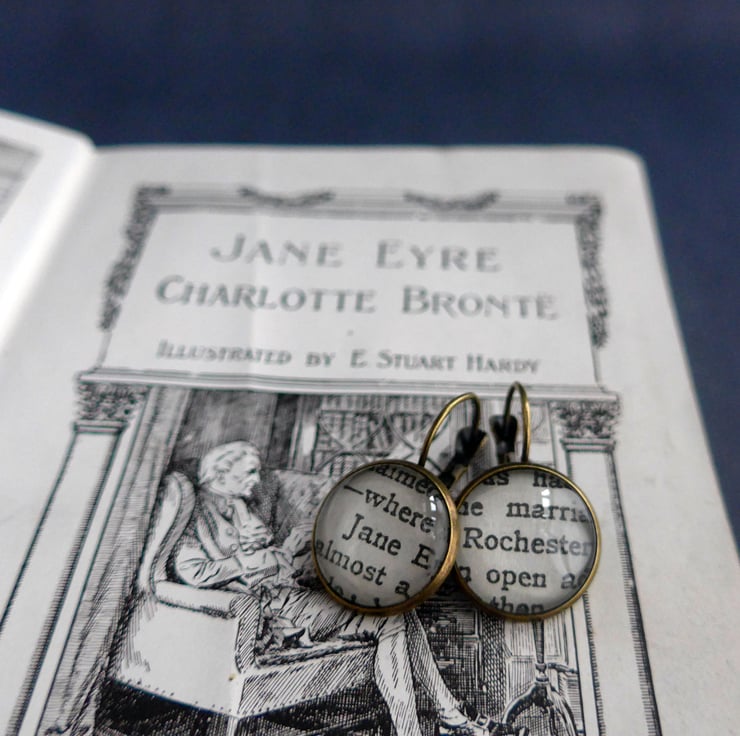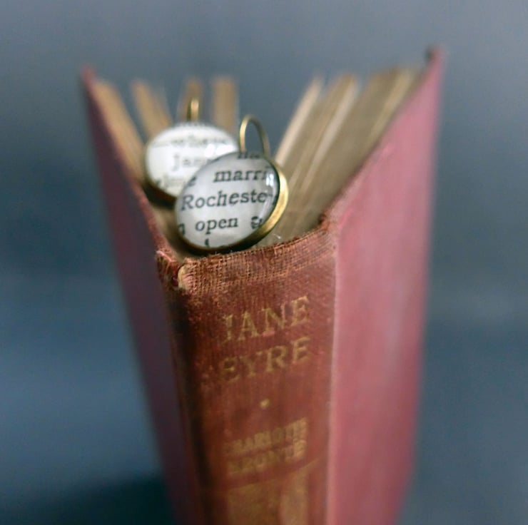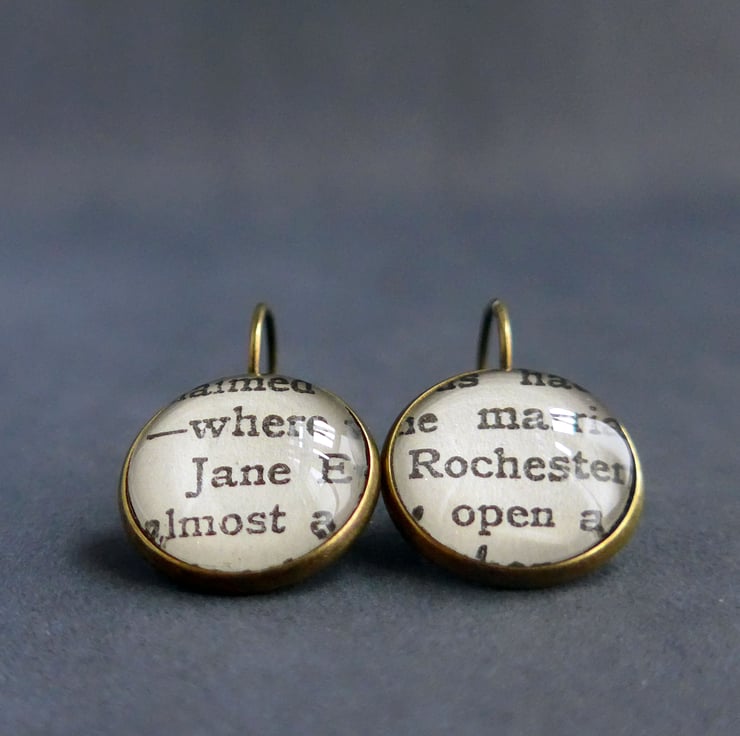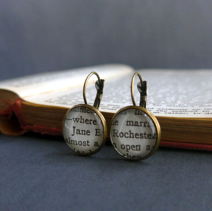 I used an old damaged copy of Jane Eyre, by Charlotte Bronte, to create these literary earrings. They feature Jane Eyre on one side and Mr Rochester on the other. If you think the book was either a love story or a tragedy, well, it is a dark tale and it's difficult to decide! Maybe it's both. But celebrate it with these earrings!