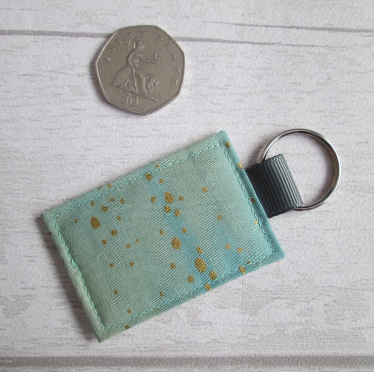 A simple fabric keyring or bag tag in a faded duck egg blue sprinkled with metallic gold speckles. It puts me in mind of the sparkles you get at the edge of the sea. The keyring is stiffened with interfacing, and finished with greeny-grey Petersham ribbon and a metal split ring which will take a selection of keys or attach to a bag strap for easy identification.