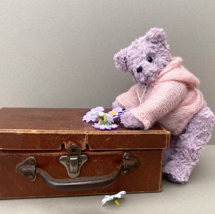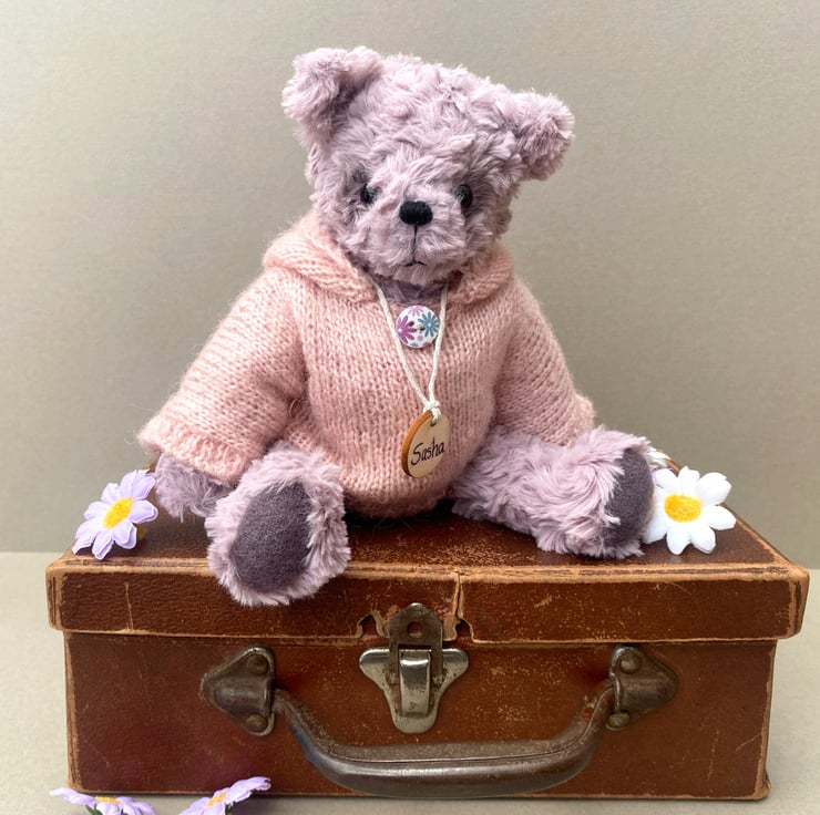 Meet Sasha, a lovely unique artist bear standing at around 10" tall and handcrafted from dusky lilac swirl faux fur. Dark Heather wool fabric has been used for her paw pads.