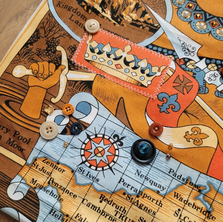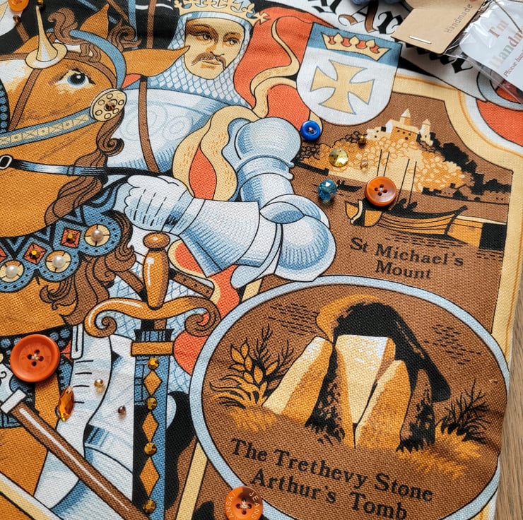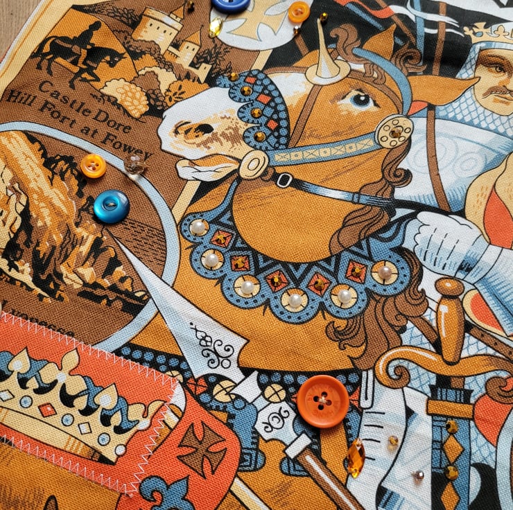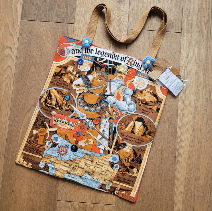 Handmade King Arthur Tote Bag . All materials sourced second-hand made with a vintage cotton tea towel, scrap embellishments, buttons and broken jewellery. Fully lined with a peach bedsheet. The back is made with a vintage floral curtain. All embellishments have been hand-sewn. No pockets. Perfect for everyday essentials. Not suitable for multiple of heavy items. Handmade from my home studio, one of a kind design. Comes with free keyring. This tea towel came with some minor stains nothing noticeable.