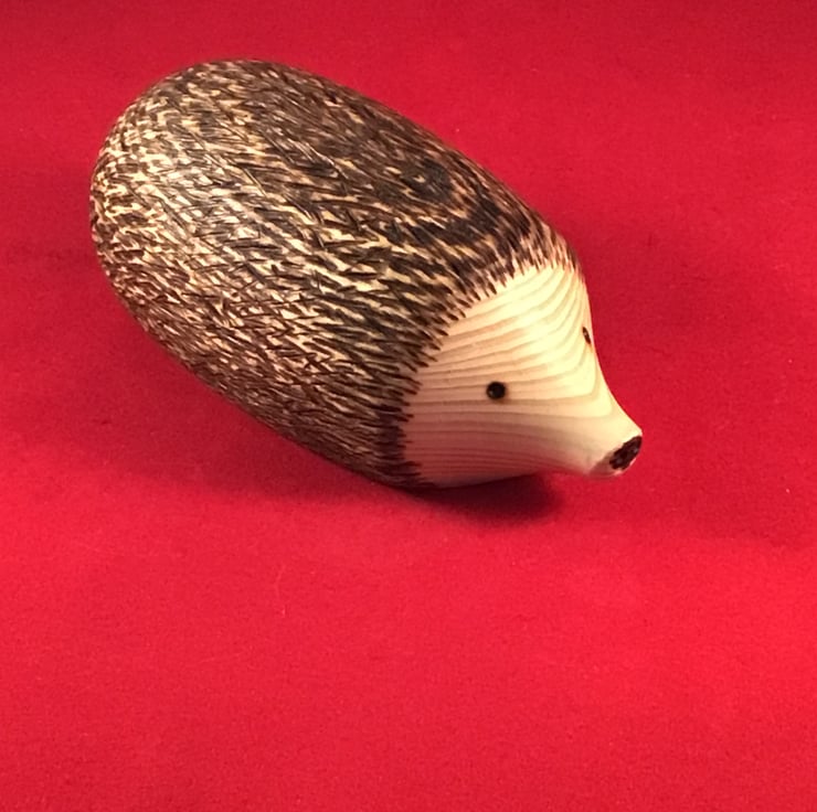 Wooden decorative hedgehog with pyrography eyes, snout and spines.