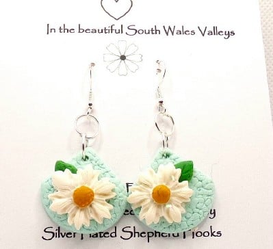 Summery feminine earrings that I have handcrafted from polymer clay featuring a white daisy on a pale mint background,