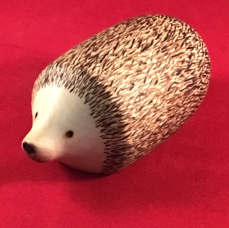Wooden decorative hedgehog with pyrography eyes, snout and spines.