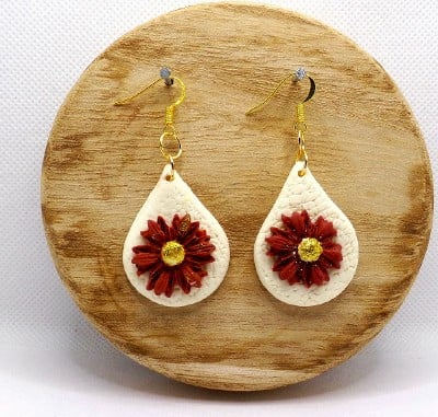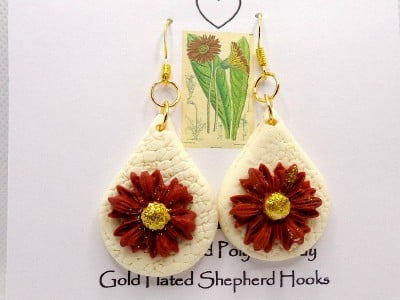 Pretty light weight statement earrings that I have handcrafted from polymer clay. The earrings feature burgundy gerbera flowers with a gold sparkle centre on a creamy ivory background.