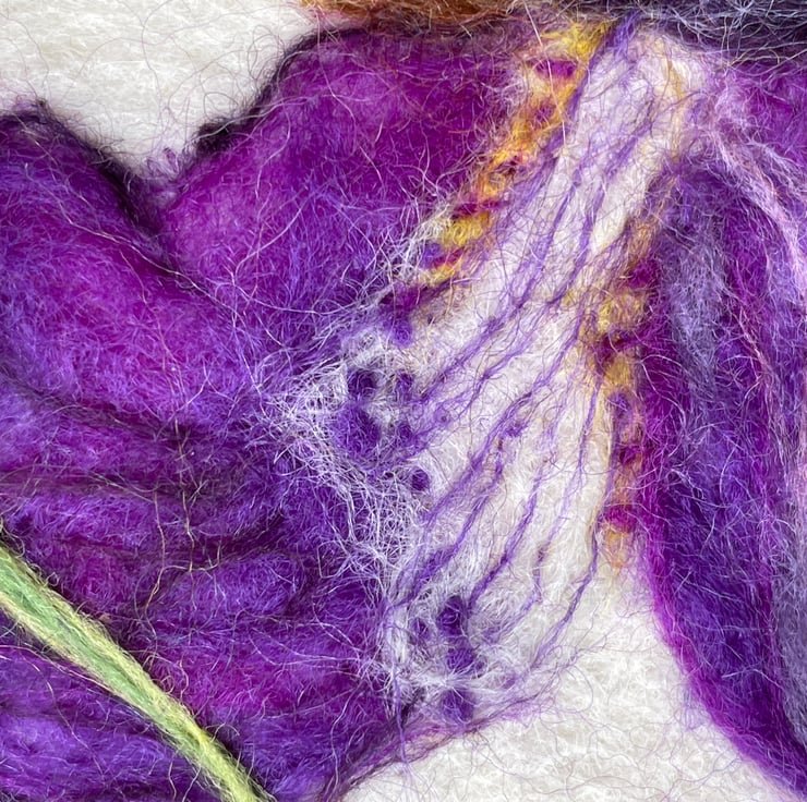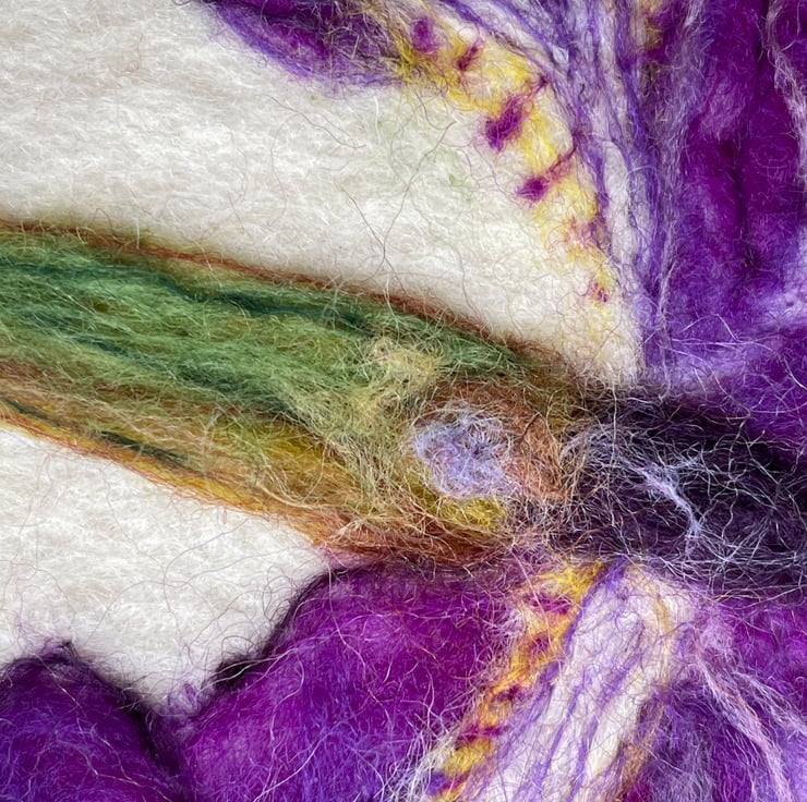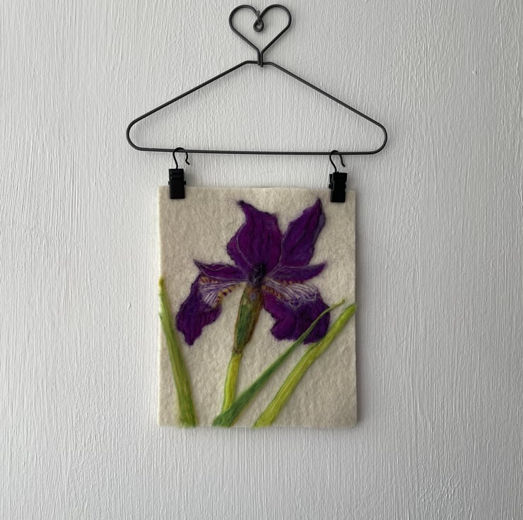 A hand-felted Iris artwork crafted from merino fleece.