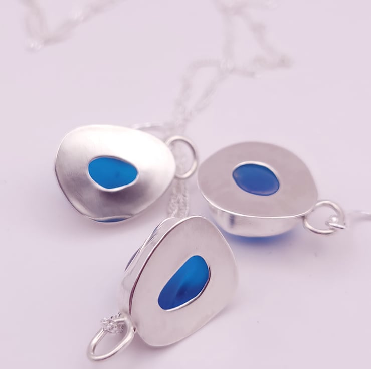 The back of the three pieces has been hand pierced in my workshop to create an opening to allow light to shine through the back of the seaglass giving it a glow.