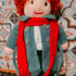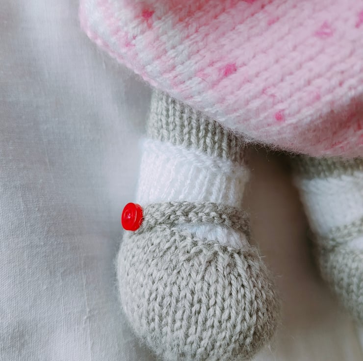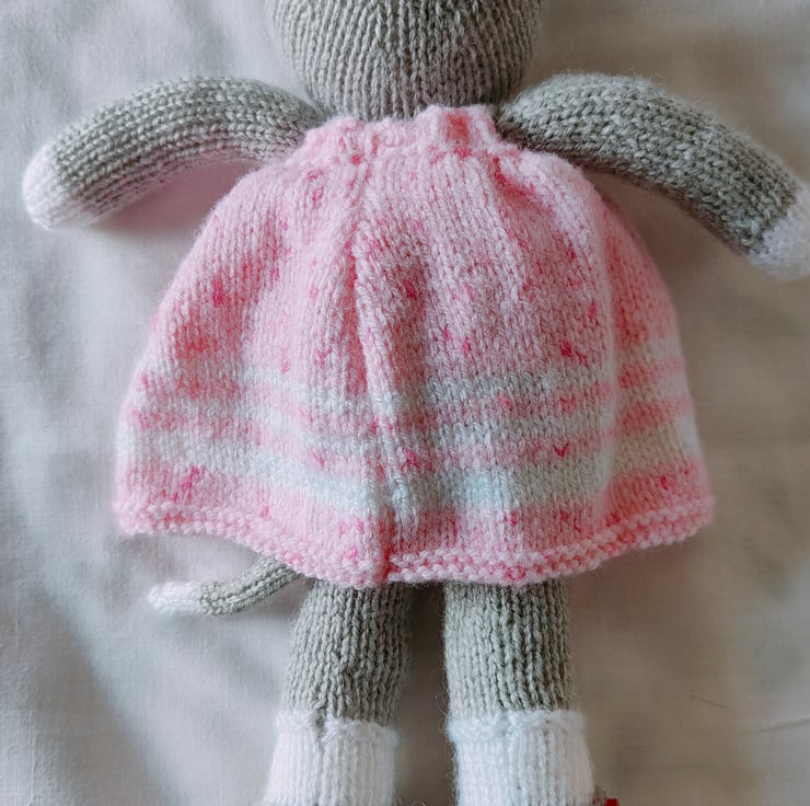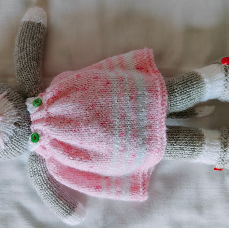 Hand knit toy cat with removable dress, knit with 100% acrylic yarn, no dangerous eyes, everything is sewn on. Machine washable. Reshape and dry flat