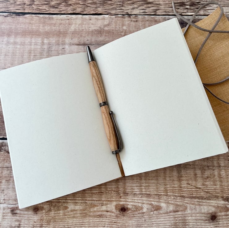 80 pages (160) sides of high quality 120gsm recycled paper are folded into four sections, then stitched into the cork fabric. The paper is suitable for all writing and drawing mediums. The journal is tied with a faux suede cord.