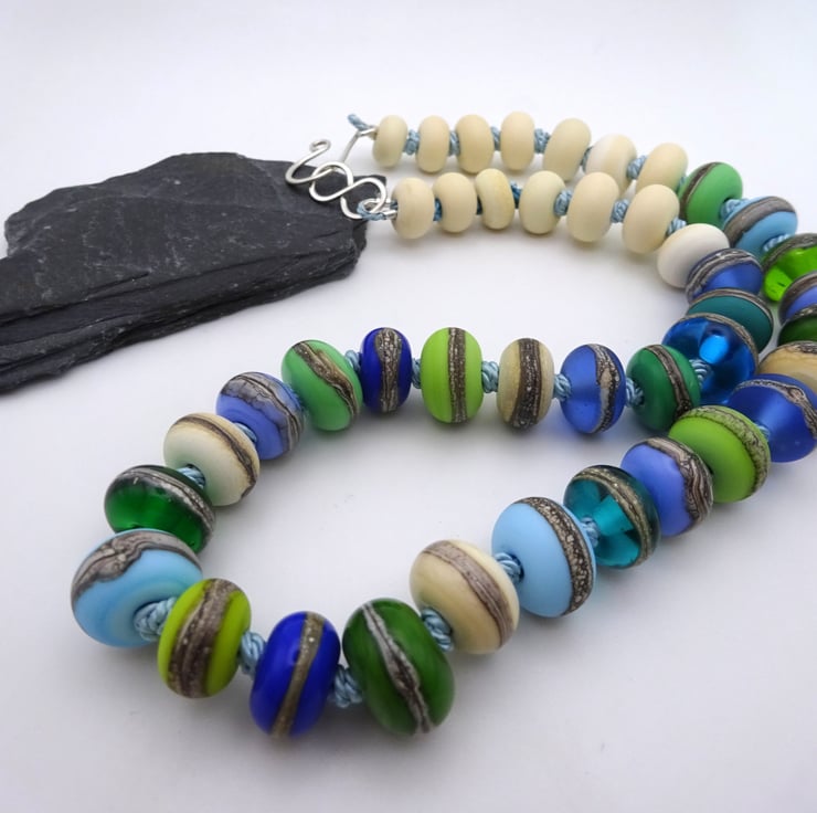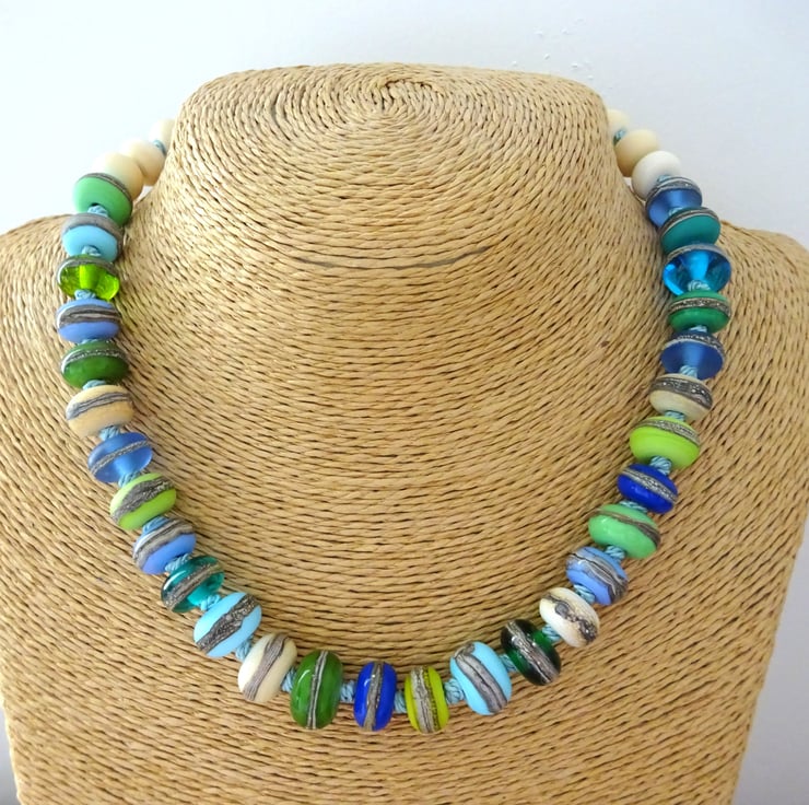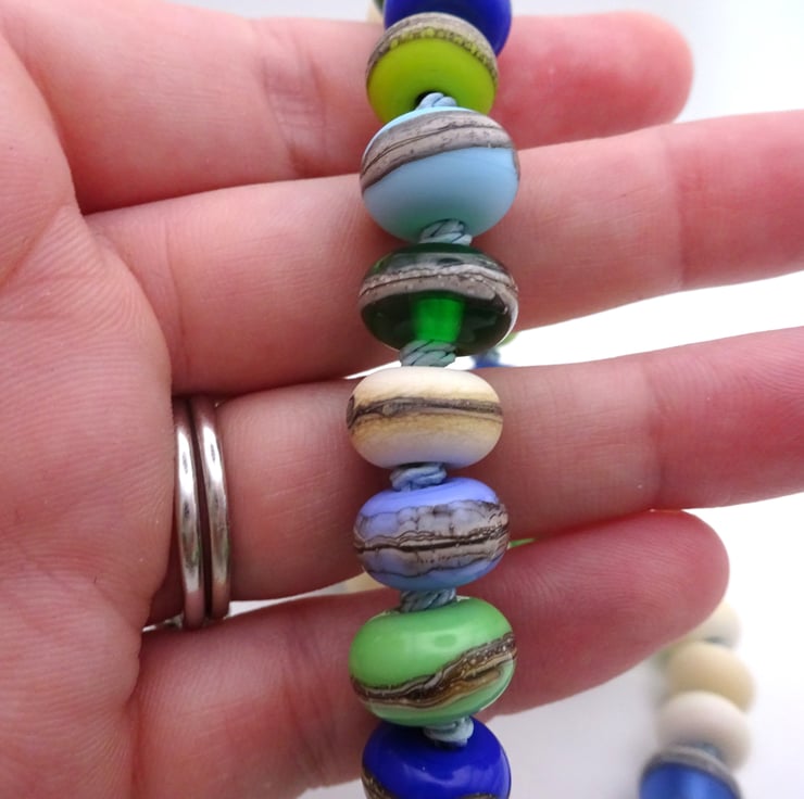 A necklace made with blue silk thread which has been knotted in between each handmade lampwork glass bead.