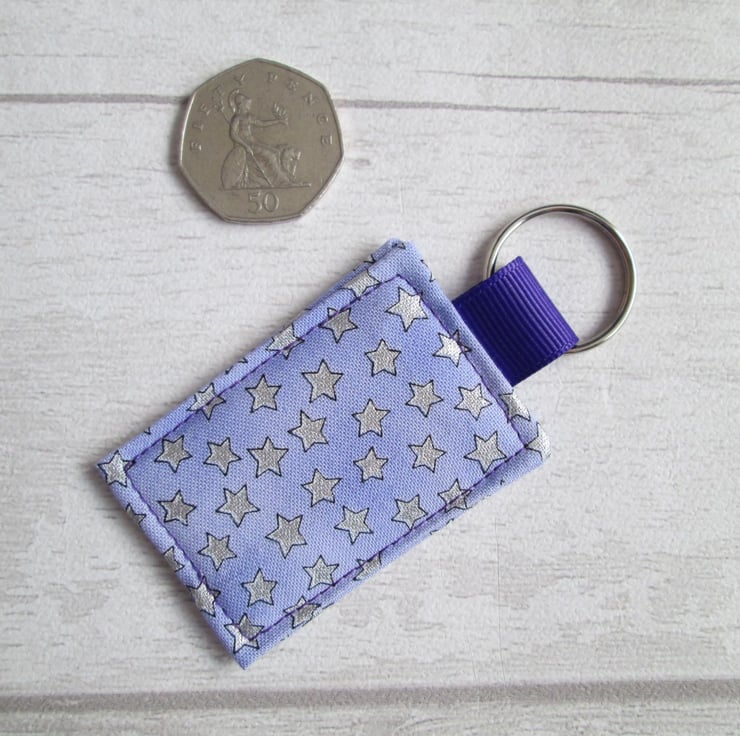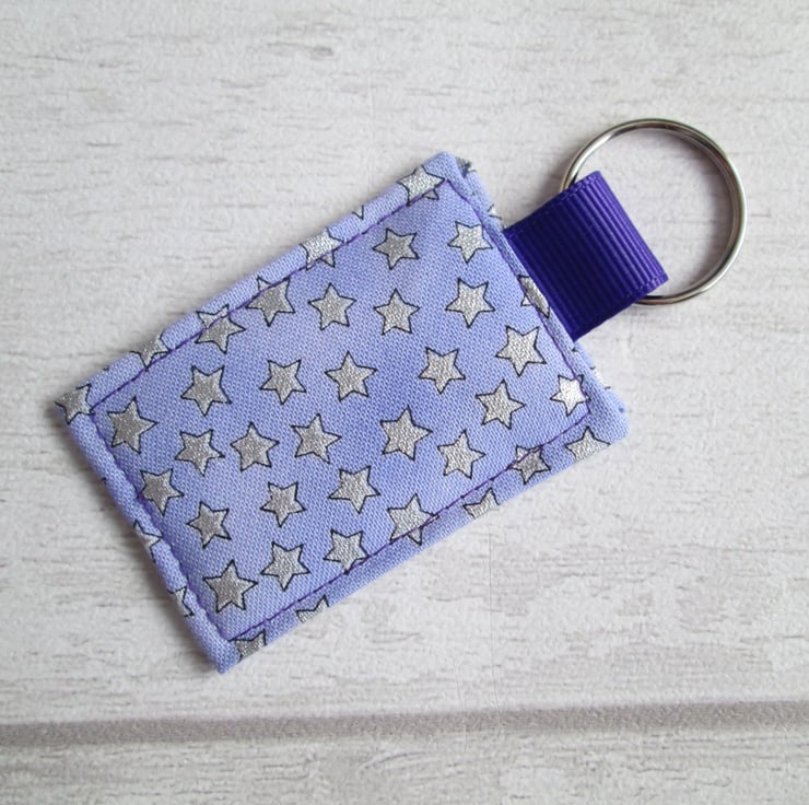 Add a little star quality to your keys with this fabric keyring or bag tag in pale lilac cotton, overprinted with tiny, metallic, silver stars. Stiffened with interfacing, it is finished with amethyst purple Petersham ribbon and a metal split ring.