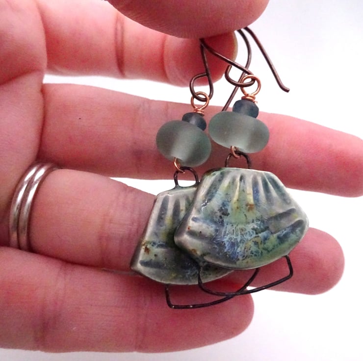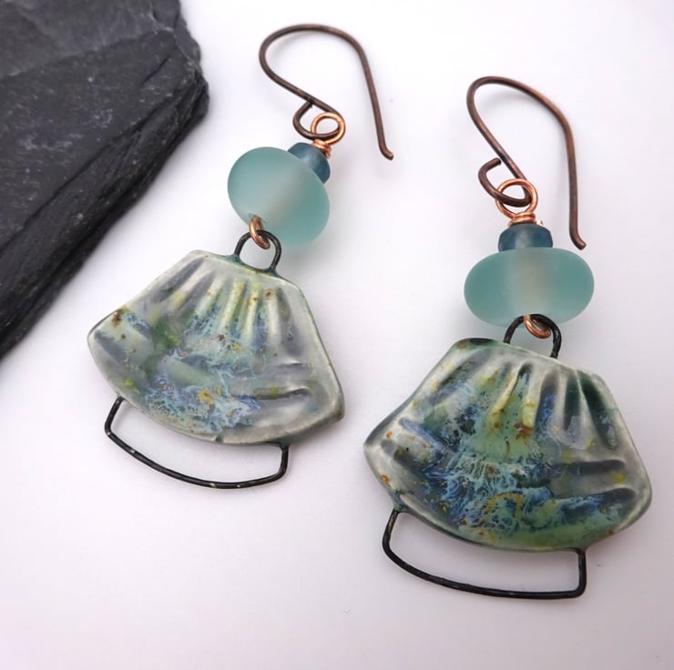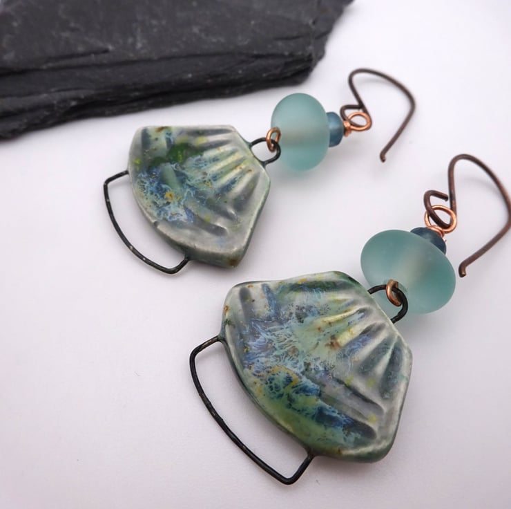 A pair of copper earrings which feature handmade lampwork glass aqua frosted beads and handmade ceramic charms.