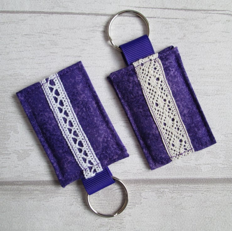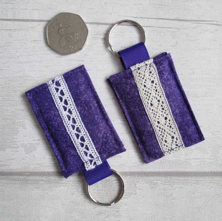 A pair of lovely, amethyst purple fabric keyrings, or bag tags, trimmed with scraps of lace from my snippets box. One is trimmed with white lace, the other with cream, and both are finished with purple Petersham ribbon and metal split rings. - Please note that my camera tends to give a blueish tinge to purple, these are proper 'chocolate wrapper' purple.
