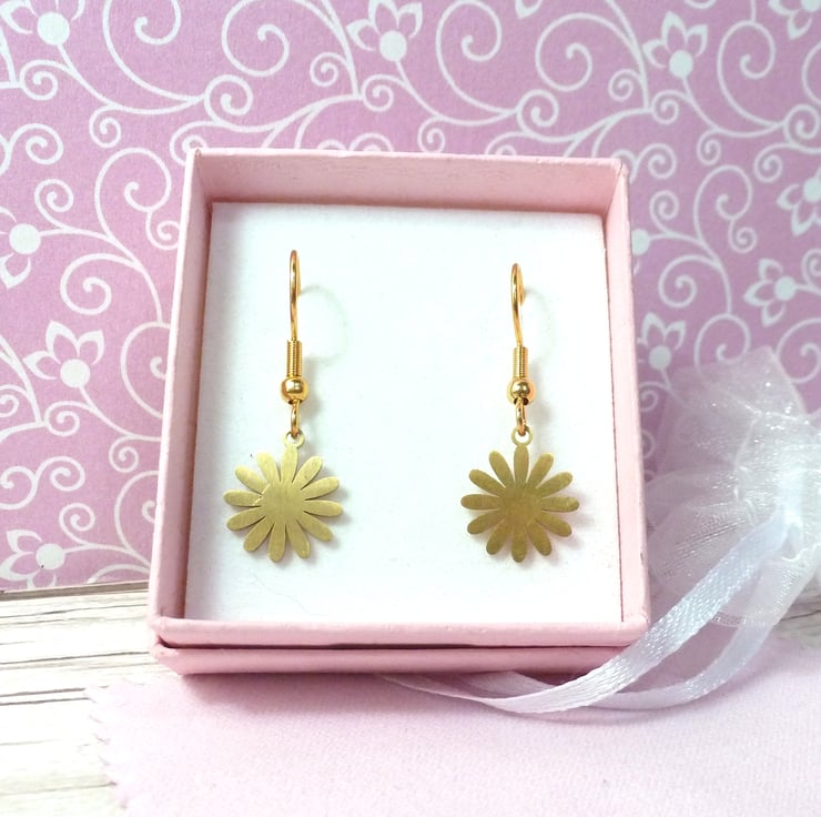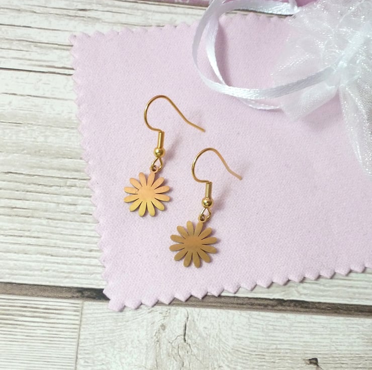 Tiny gold-plated daisy dangle earrings, dainty gold flower earrings for women. Lightweight earrings made from laser cut gold-plated Stainless Steel, with gold-plated Stainless Steel wires. The gold daisies are 12mm in diameter.