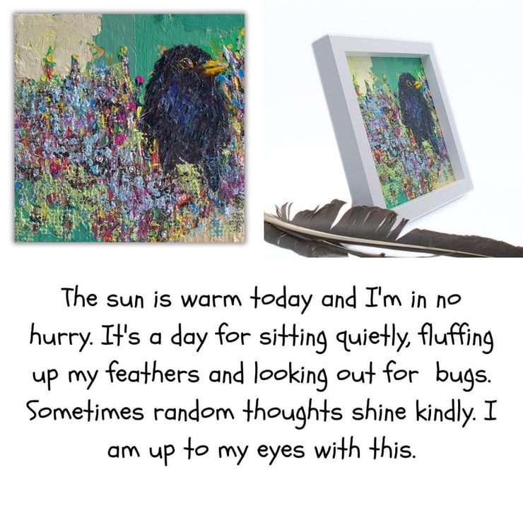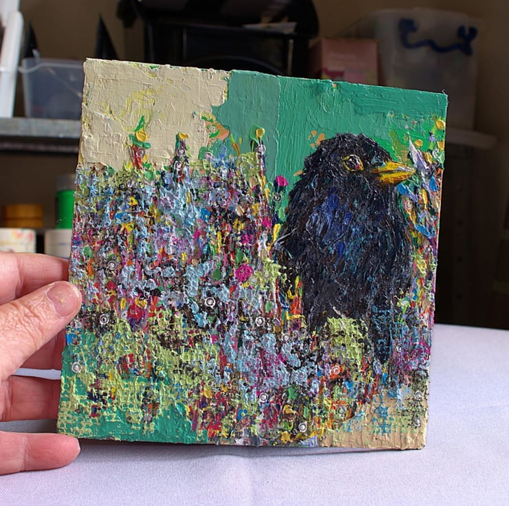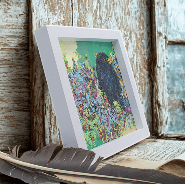 This is a framed impasto painting featuring a blackbird resting amongst wildflowers. I have used multiple layers of professional-quality acrylics mixed with water-based cold wax to add depth and texture. I have applied the paint mix using a variety of painting knives, brushes and my own hands. Some key features include:
