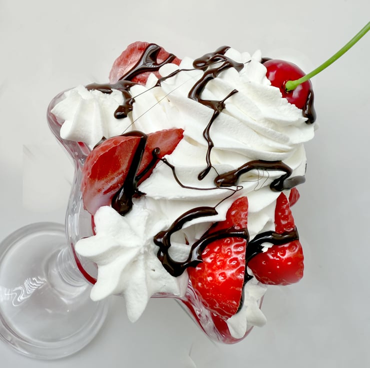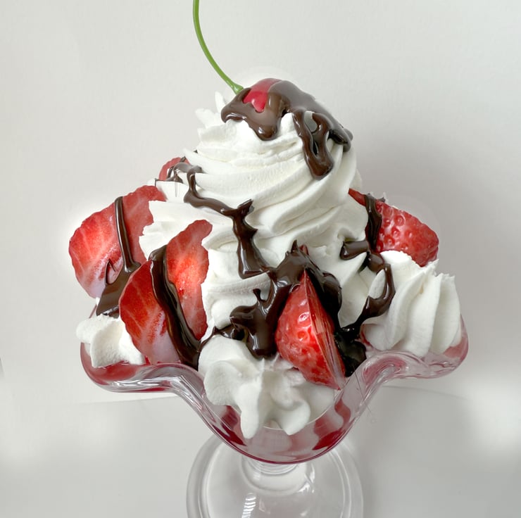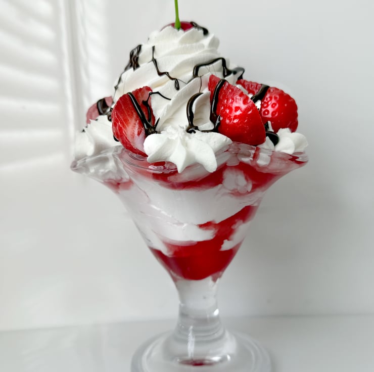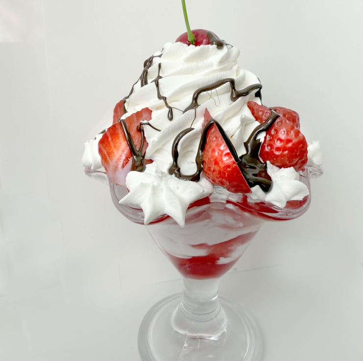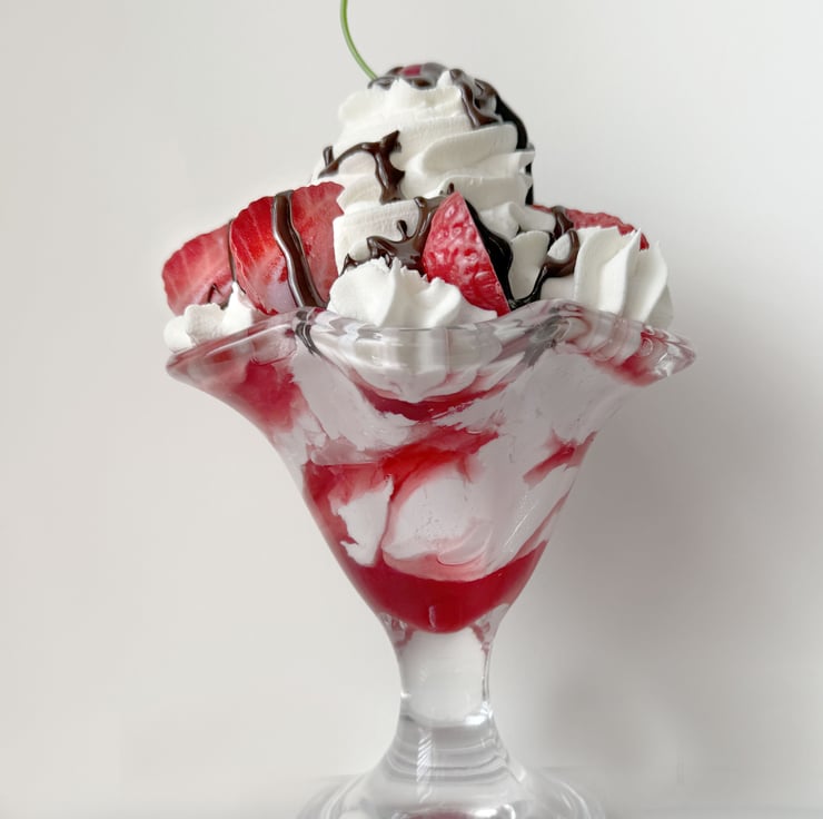 Gorgeous fake food strawberry sundae made with fake pink and white ice cream, fake cream topping, red cherry, chocolate sauce and strawberry halves.