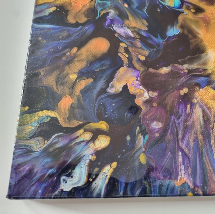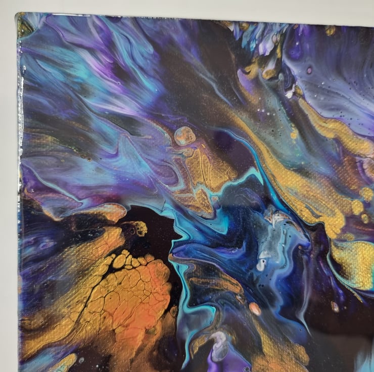 This painting was created using the Dutch Pour method. The initial blow out sets the scene. This is then further developed using additional paint which is added and blown across various parts of the painting. This organic development allows the picture to develop slowly. The result is bursting with activity.