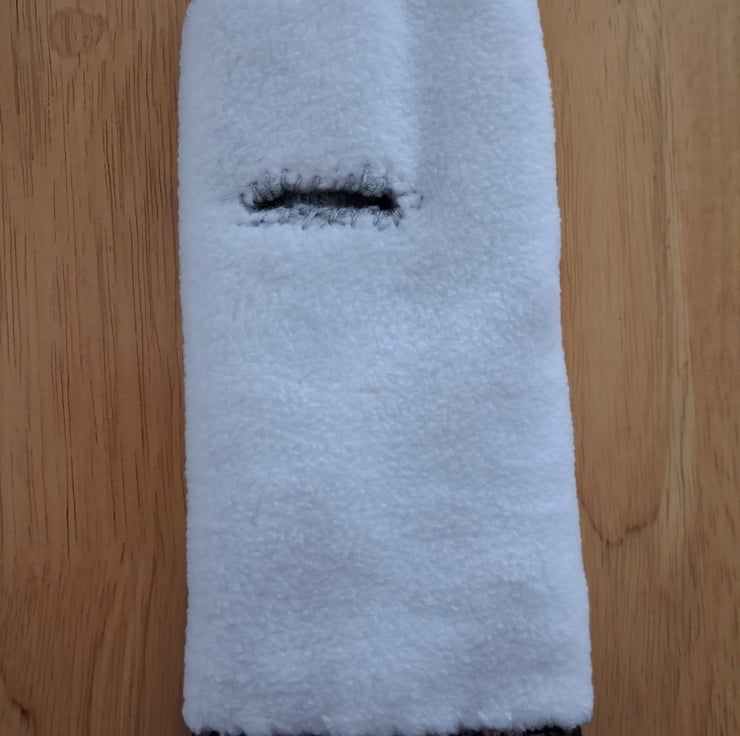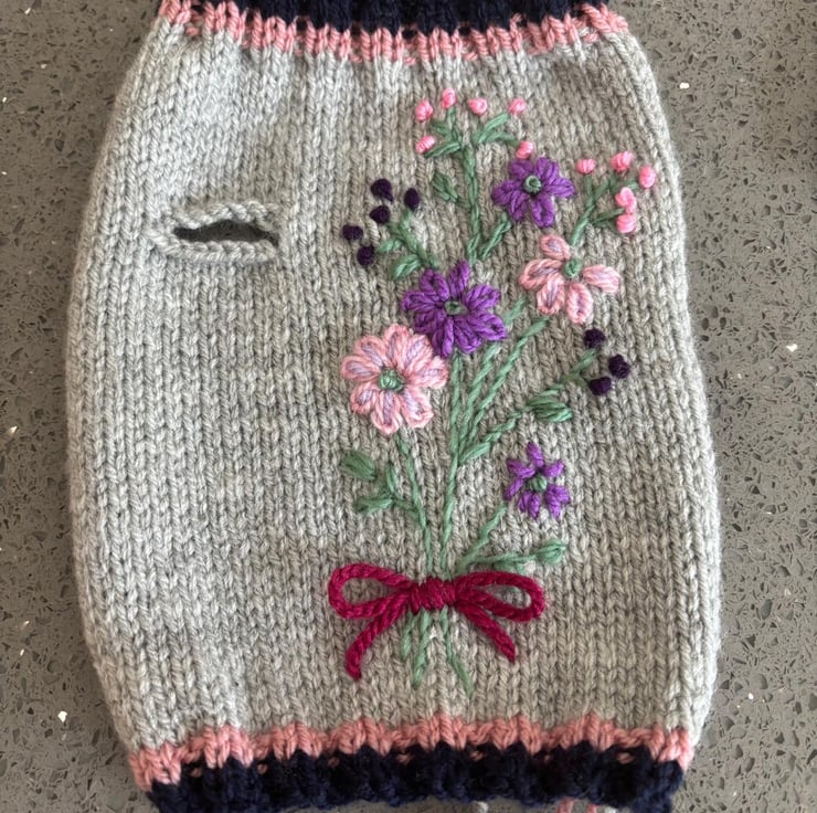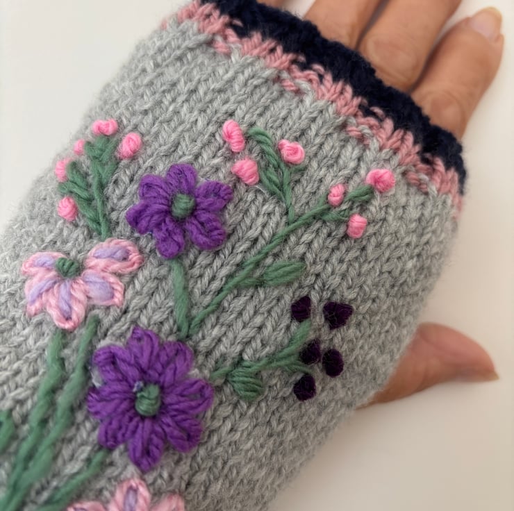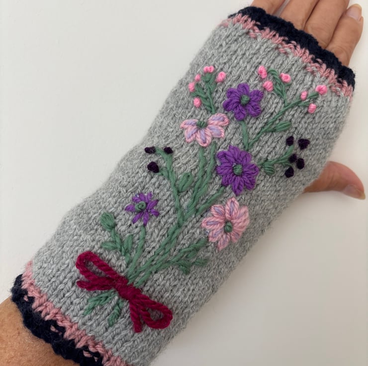 This is a pair of hand knitted and then free hand embroidered fingerless gloves. The glove is a pale grey with pink and navy edging. The flowers are embroidered by hand and therefore may vary slightly. The spray of flowers are finished with a pink bow at the wrist. The gloves are lined with white fleece making them extra cosy. They would fit a small to medium hand and are 20cm long. There is also a matching headband in the shop.