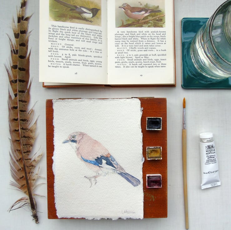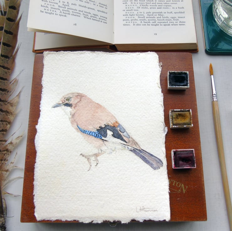 Unframed original watercolour painting of a secretive jay I was lucky to observe on one occasion at the bird hide. One of a set of four original paintings inspired by visits to a bird hide near Bamburgh in Northumberland.