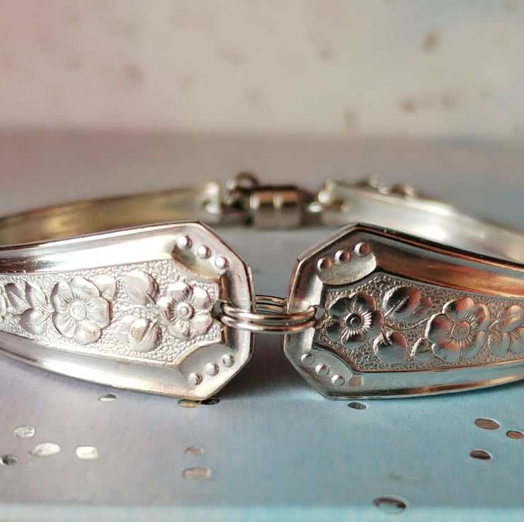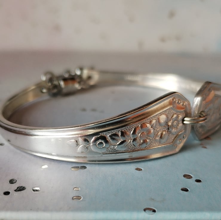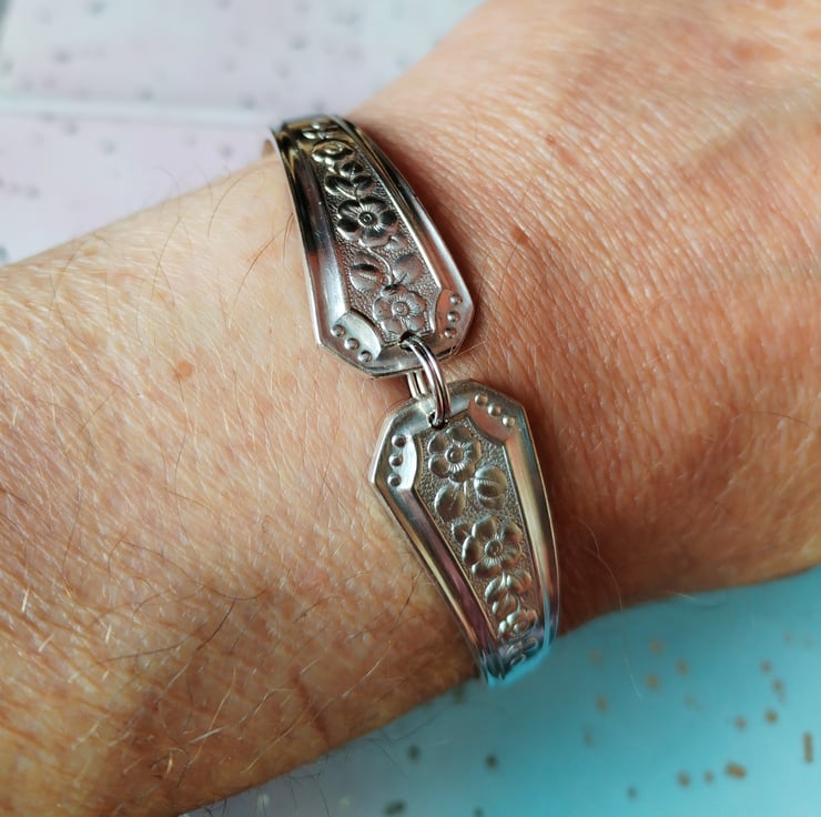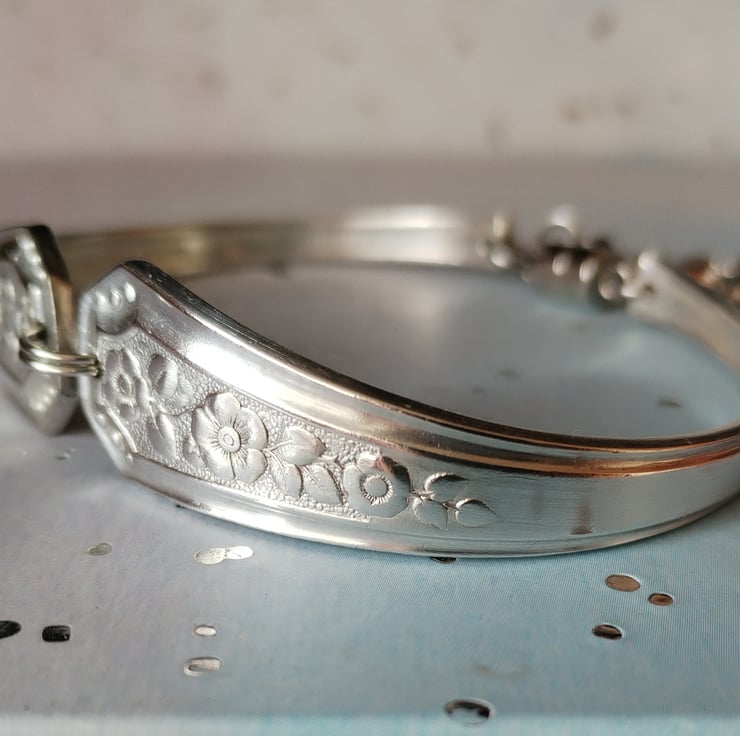 Lovely flower pattern on this handmade silver plated spoon handle bracelet, upcycled from lonely old vintage spoons and given a new lease of life.