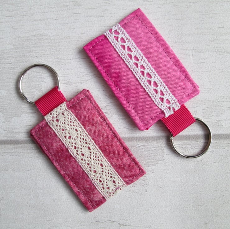 A bright pop of pink to help you find your keys or bags - this pair of fabric keyrings are made from pink cotton - one a lovely crushed strawberry, the other hot pink - and trimmed with snippets of lace from scrap box. Both tags are stiffened with interfacing and finished with hot pink Petersham ribbon and metal split rings.