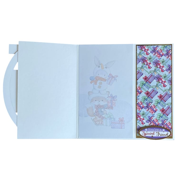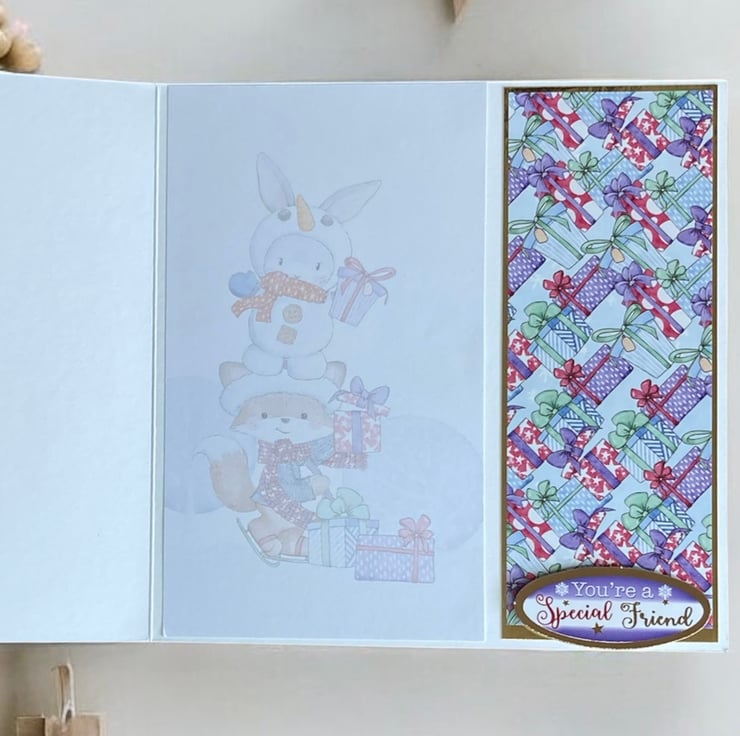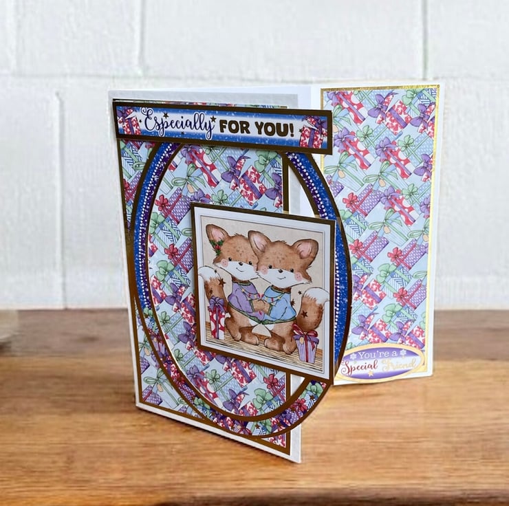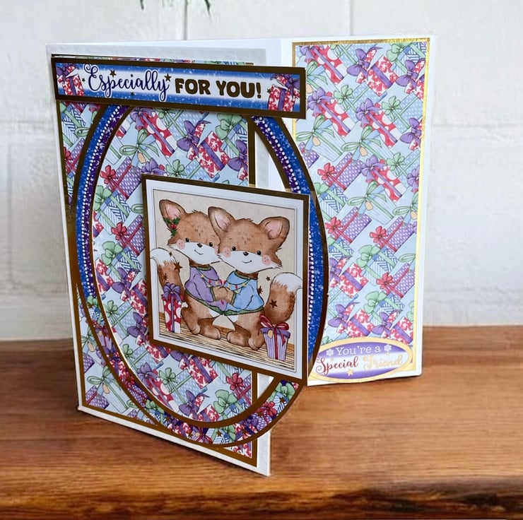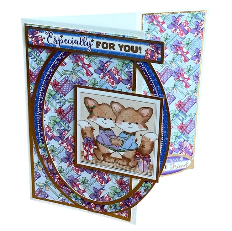 The card has been layered with paper decorated with Christmas presents. Gold foiled toppers have been added with cute foxes and the greeting Especially For You. The front of the card has been shaped to reveal the inside decoration and has the words You’re a Special Friend. The inside has a decorated panel with a snowy scene with cute furry friends.