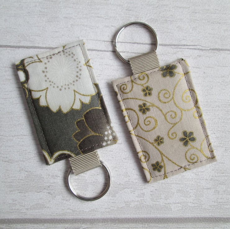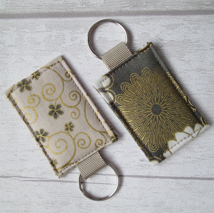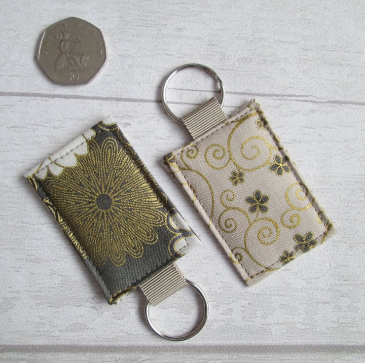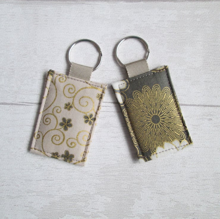 A pair of keyrings or bag tags in neutral floral fabrics with gold metallic highlights, one little taupe flowers and gold scrolls on a pale background, the other Japanese style flowers on a taupe background. Both tags are stiffened with interfacing and finished with coordinating Petersham ribbon and metal split rings.