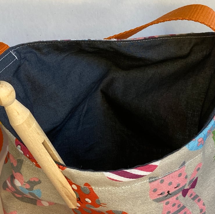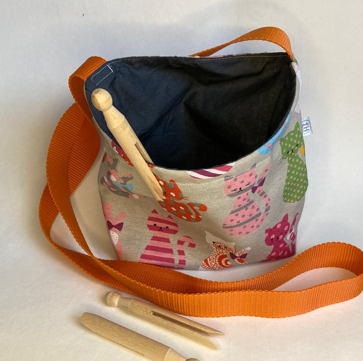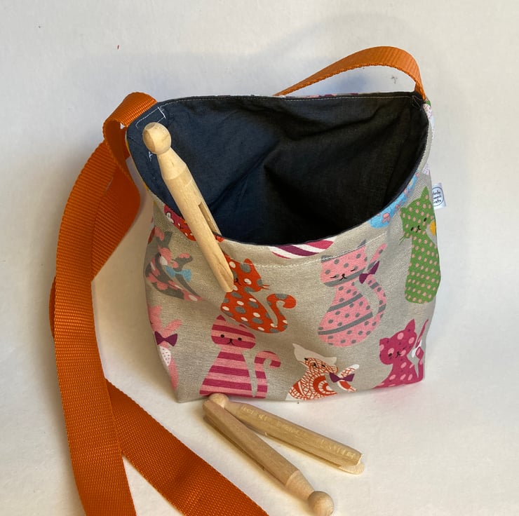 We all know that line-drying is the most environmentally friendly way of getting the washing dry and this peg bag adds convenience to that simple pleasure. This colourful bag is something different. It is made from strong grey cotton fabric decorated with multicoloured cats. The bag is lined with plain dark grey cotton fabric and the long, over-the-shoulder strap is orange.
