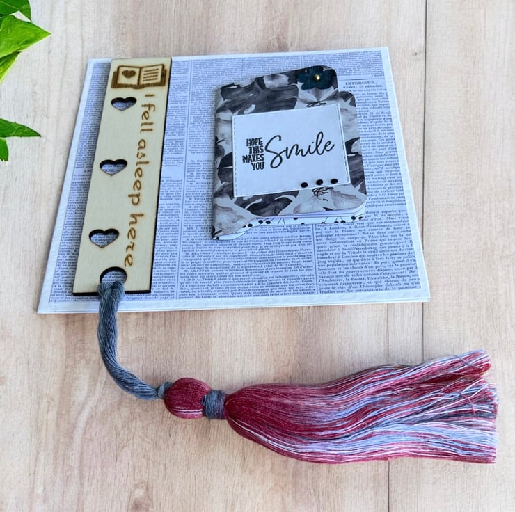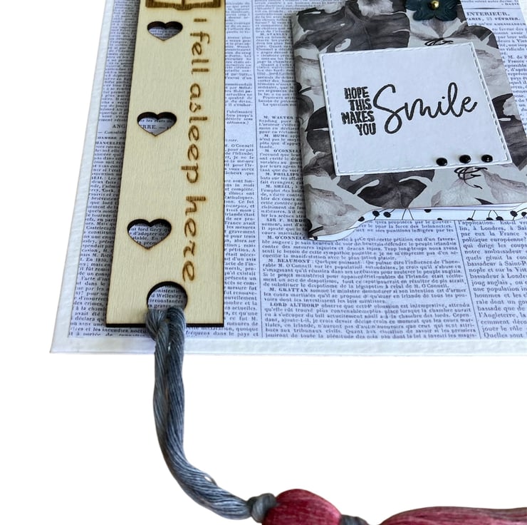 This gift set features a card decorated with a book page background, a laser engraved bookmark featuring the words I fell asleep here and a little book hand stamped with inspirational and uplifting quotes.